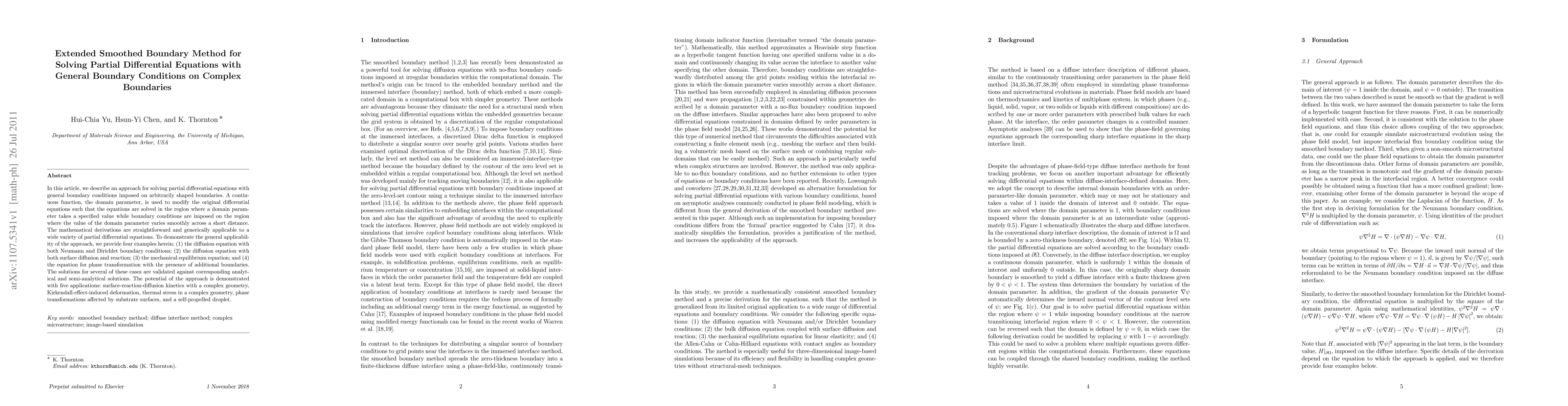 In this article, we describe an approach for solving partial differential equations with general boundary conditions imposed on arbitrarily shaped boundaries. A continuous function, the domain parameter, is used to modify the original differential equations such that the equations are solved in the region where a domain parameter takes a specified value while boundary conditions are imposed on the region where the value of the domain parameter varies smoothly across a short distance. The mathematical derivations are straightforward and generically applicable to a wide variety of partial differential equations. To demonstrate the general applicability of the approach, we provide four examples herein: (1) the diffusion equation with both Neumann and Dirichlet boundary conditions; (2) the diffusion equation with both surface diffusion and reaction; (3) the mechanical equilibrium equation; and (4) the equation for phase transformation with the presence of additional boundaries. The solutions for several of these cases are validated against corresponding analytical and semi-analytical solutions. The potential of the approach is demonstrated with five applications: surface-reaction-diffusion kinetics with a complex geometry, Kirkendall-effect-induced deformation, thermal stress in a complex geometry, phase transformations affected by substrate surfaces, and a self-propelled droplet.