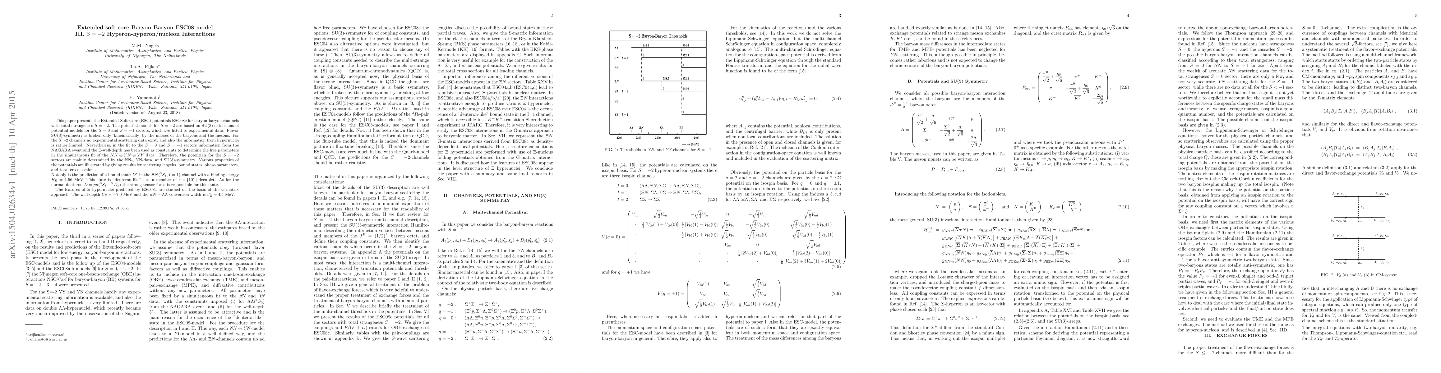 This paper introduces the ESC08c potentials for baryon-baryon interactions with S=-2 strangeness, derived from SU(3)-extended ESC models for S=0 and S=-1 sectors. The model predicts a bound state D* in the $\Xi N(^3S_1,I=1)$ channel, akin to the deuteron, and provides insights into $\Xi$ hypernuclei properties.