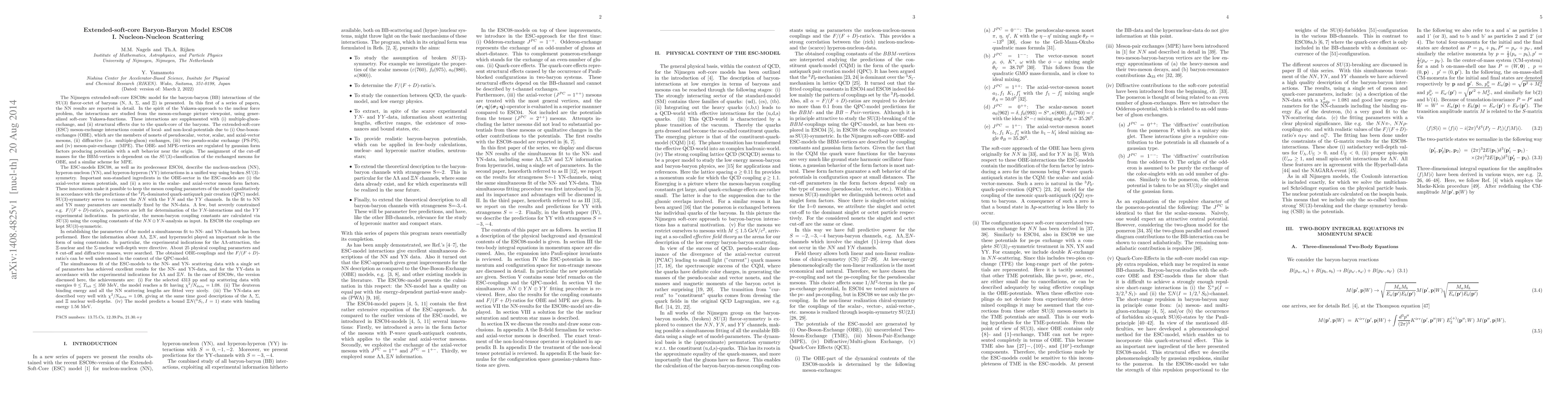 The Nijmegen extended-sft-core ESC08c model for the baryon-baryon (BB) interactions of the SU(3) flavor-octet of baryons ($N, \Lambda, \Sigma$, and $\Xi$) is presented. In this first of a series of papers, the NN results are reported in detail. In the spirit of the Yukawa-approach to the nuclear force problem, the interactions are studied from the meson-exchange picture viewpoint, using generalized soft-core Yukawa-functions. These interactions are supplemented with (i) multiple-gluon-exchange, and (ii) structural effects due to the quark-core of the baryons. The extended-soft-core (ESC) meson-exchange interactions consist of local- and non-local-potentials due to ((i) One-boson-exchanges (OBE, which are the members of nonets of pseudoscalar , vector, scalar, and axial-vector mesons, (ii) diffractive (i.e. multiple-gluon) exchanges, (iii) two pseudoscalar exchange (PS-PS), and (iv) meson-pair-exchange (MPE). The OBE- and MPE-vertices are regulated by gaussian form factors producing potentials with a soft behavior near the origin. The assignment of the cut-off masses for the BBM-vertices is dependent on the SU(3)-classification of the exchanged mesons for OBE, and a similar scheme for MPE. The simultaneous fit of the ESC-models to the NN- and YN-scattering data achieved excellent results for the NN, YN, and favorable properties for the $\Lambda\Lambda$ and $\Xi N$ systems. In the case of ESC08c, the version of this paper, the results are: (i) For the selected 4313 pp and np scattering data ($ 0 \leq T_{lab} \leq 350$ MeV), the model achieved $\chi^2/N_{data} = 1.08$. (ii) The deuteron binding energy and all NN low energy parameters are fitted very nicely. (iii) The YN-data are described also very well with $\chi^/N_{data} = 1.09$. (iv) The model predicts a bound $\Xi N(^3S_1,I=1)$ states with binding energy 1.56 MeV.