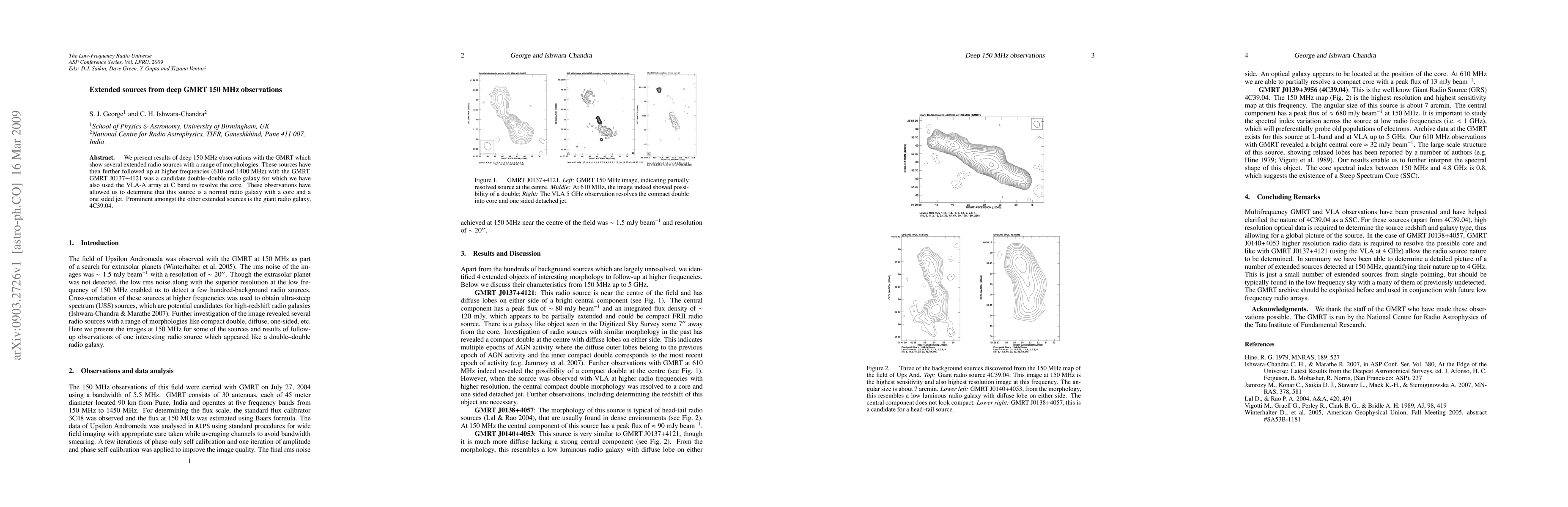 We present results of deep 150 MHz observations with the GMRT which show several extended radio sources with a range of morphologies. These sources have then further followed up at higher frequencies (610 and 1400 MHz) with the GMRT. GMRT J0137+4121 was a candidate double--double radio galaxy for which we have also used the VLA-A array at C band to resolve the core. These observations have allowed us to determine that this source is a normal radio galaxy with a core and a one sided jet. Prominent amongst the other extended sources is the giant radio galaxy, 4C39.04.