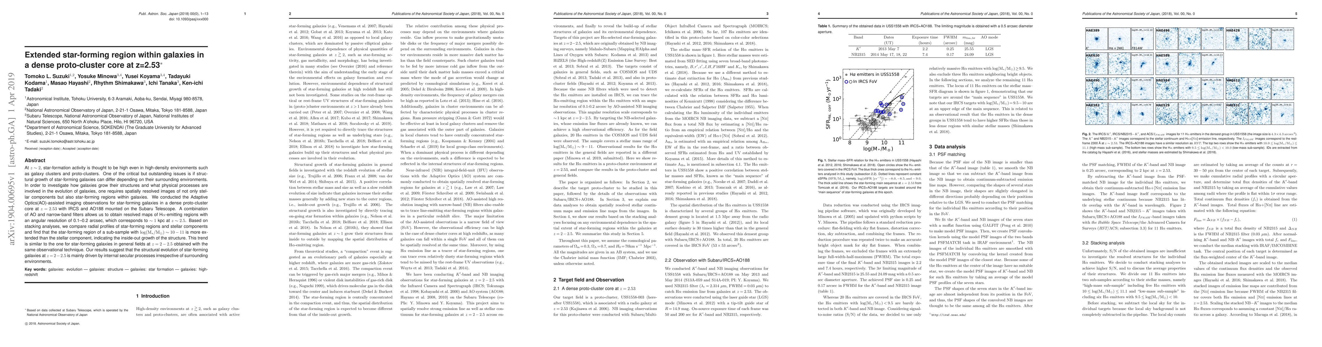 At $z\sim2$, star-formation activity is thought to be high even in high-density environments such as galaxy clusters and proto-clusters. One of the critical but outstanding issues is if structural growth of star-forming galaxies can differ depending on their surrounding environments. In order to investigate how galaxies grow their structures and what physical processes are involved in the evolution of galaxies, one requires spatially resolved images of not only stellar components but also star-forming regions within galaxies. We conducted the Adaptive Optics(AO)-assisted imaging observations for star-forming galaxies in a dense proto-cluster core at $z=2.53$ with IRCS and AO188 mounted on the Subaru Telescope. A combination of AO and narrow-band filters allows us to obtain resolved maps of H$\alpha$-emitting regions with an angular resolution of 0.1--0.2~arcsec, which corresponds to $\sim1$ kpc at $z\sim2.5$. Based on stacking analyses, we compare radial profiles of star-forming regions and stellar components and find that the star-forming region of a sub-sample with $\rm log(M_*/M_\odot)\sim10-11$ is more extended than the stellar component, indicating the inside-out growth of the structure. This trend is similar to the one for star-forming galaxies in general fields at $z=2-2.5$ obtained with the same observational technique. Our results suggest that the structural evolution of star-forming galaxies at $z=2-2.5$ is mainly driven by internal secular processes irrespective of surrounding environments.