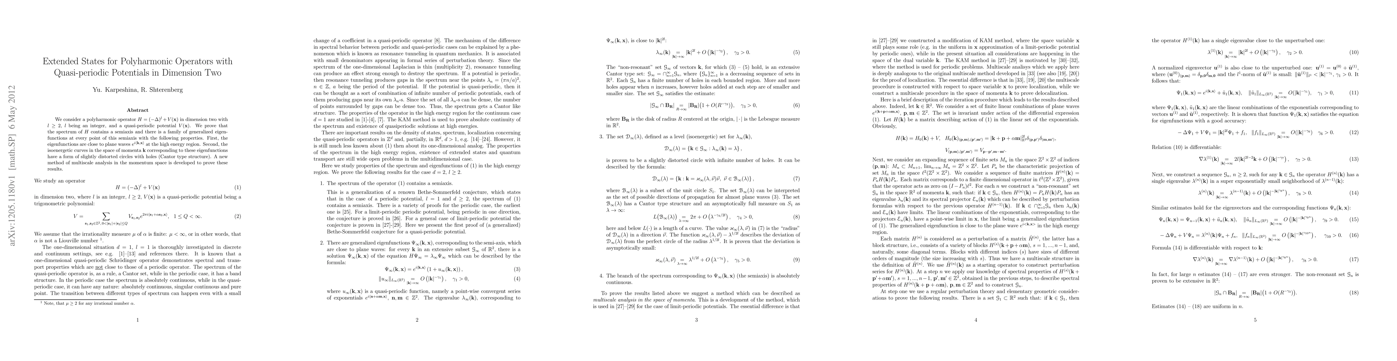 We consider a polyharmonic operator $H=(-\Delta)^l+V(\x)$ in dimension two with $l\geq 2$, $l$ being an integer, and a quasi-periodic potential $V(\x)$. We prove that the spectrum of $H$ contains a semiaxis and there is a family of generalized eigenfunctions at every point of this semiaxis with the following properties. First, the eigenfunctions are close to plane waves $e^{i< \k,\x>}$ at the high energy region. Second, the isoenergetic curves in the space of momenta $\k$ corresponding to these eigenfunctions have a form of slightly distorted circles with holes (Cantor type structure). A new method of multiscale analysis in the momentum space is developed to prove these results.
