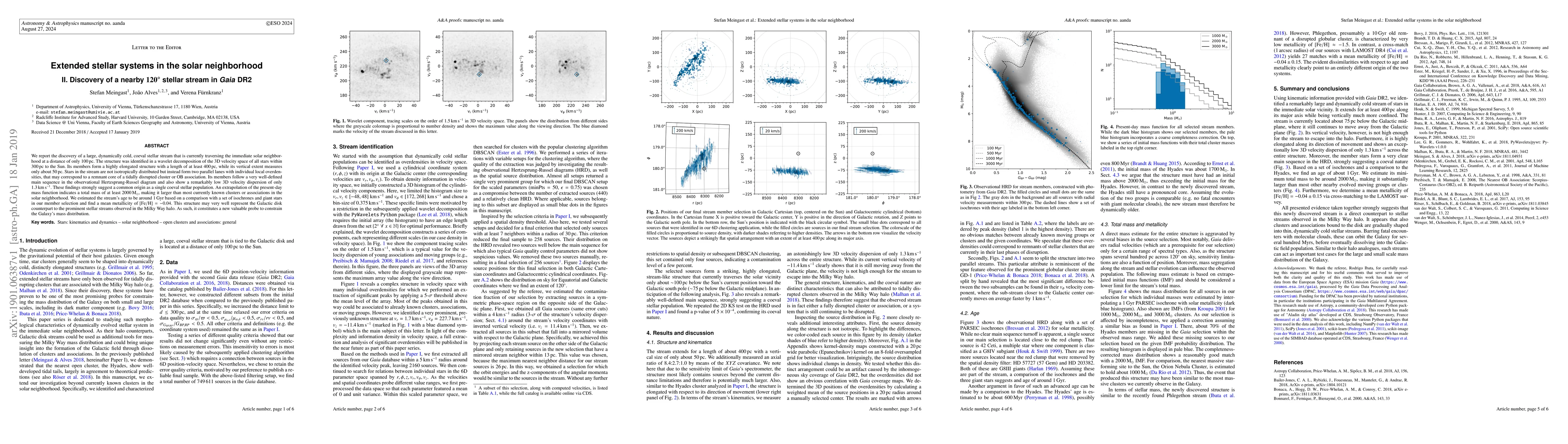 We report the discovery of a large, dynamically cold, coeval stellar stream that is currently traversing the immediate solar neighborhood at a distance of only 100 pc. The structure was identified in a wavelet decomposition of the 3D velocity space of all stars within 300 pc to the Sun. Its members form a highly elongated structure with a length of at least 400 pc, while its vertical extent measures only about 50 pc. Stars in the stream are not isotropically distributed but instead form two parallel lanes with individual local overdensities, that may correspond to a remnant core of a tidally disrupted cluster or OB association. Its members follow a very well-defined main sequence in the observational Hertzsprung-Russel diagram and also show a remarkably low 3D velocity dispersion of only 1.3 km s$^{-1}$. These findings strongly suggest a common origin as a single coeval stellar population. An extrapolation of the present-day mass function indicates a total mass of at least 2000 M$_\odot$, making it larger than most currently known clusters or associations in the solar neighborhood. We estimated the stream's age to be around 1 Gyr based on a comparison with a set of isochrones and giant stars in our member selection and find a mean metallicity of $\left[ \mathrm{Fe/H} \right] = -0.04$. This structure may very well represent the Galactic disk counterpart to the prominent stellar streams observed in the Milky Way halo. As such, it constitutes a new valuable probe to constrain the Galaxy's mass distribution.