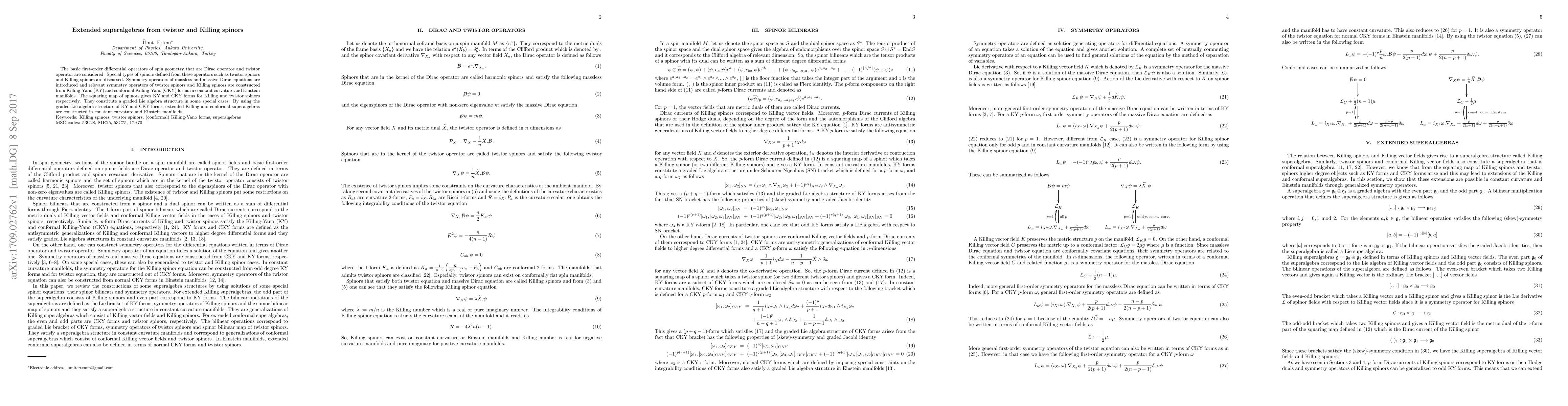 This paper explores the construction of extended superalgebras from twistor and Killing spinors, utilizing Dirac and twistor operators. It constructs symmetry operators for massless and massive Dirac equations and introduces graded Lie algebra structures from Killing-Yano and conformal Killing-Yano forms, leading to the development of extended Killing and conformal superalgebras in specific geometric settings.