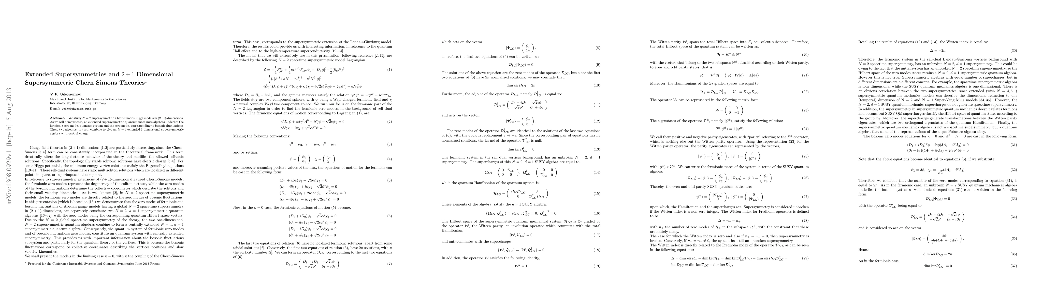 Summary: This paper explores N=2 supersymmetric Chern-Simons Higgs models in 2+1 dimensions, revealing that extended supersymmetric quantum mechanics algebras underlie the fermionic and bosonic zero modes, ultimately combining to form an N=4 extended 1-dimensional supersymmetric algebra with central charge.