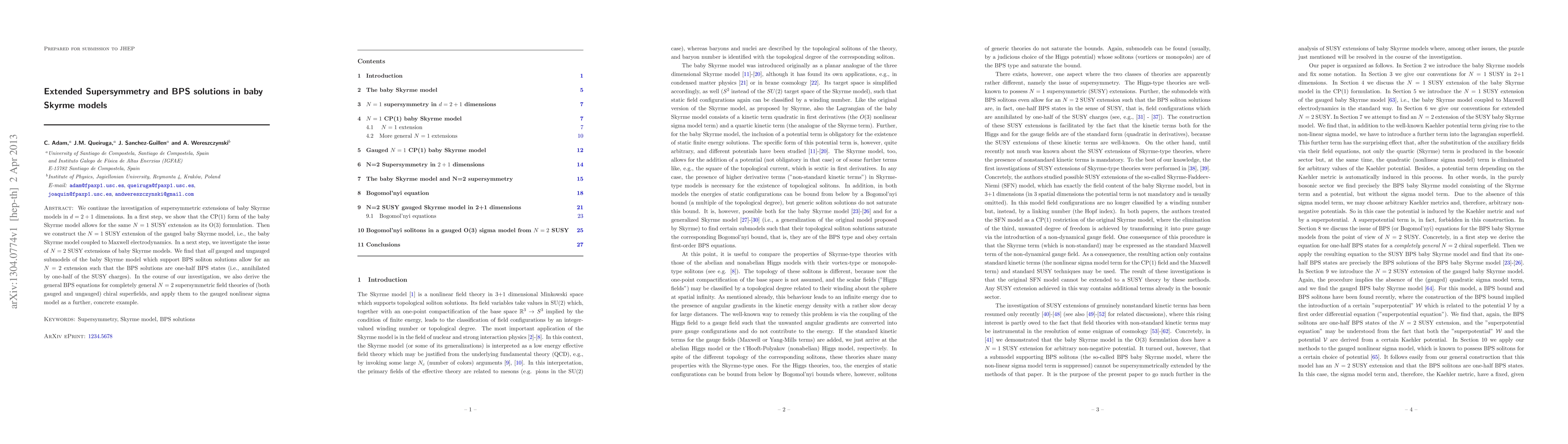 This paper explores supersymmetric extensions of baby Skyrme models in 2+1 dimensions, demonstrating that both CP(1) and O(3) forms can support N=1 supersymmetry. It constructs N=1 supersymmetric versions of gauged baby Skyrme models and identifies conditions under which N=2 supersymmetric extensions can preserve BPS soliton solutions as one-half BPS states.