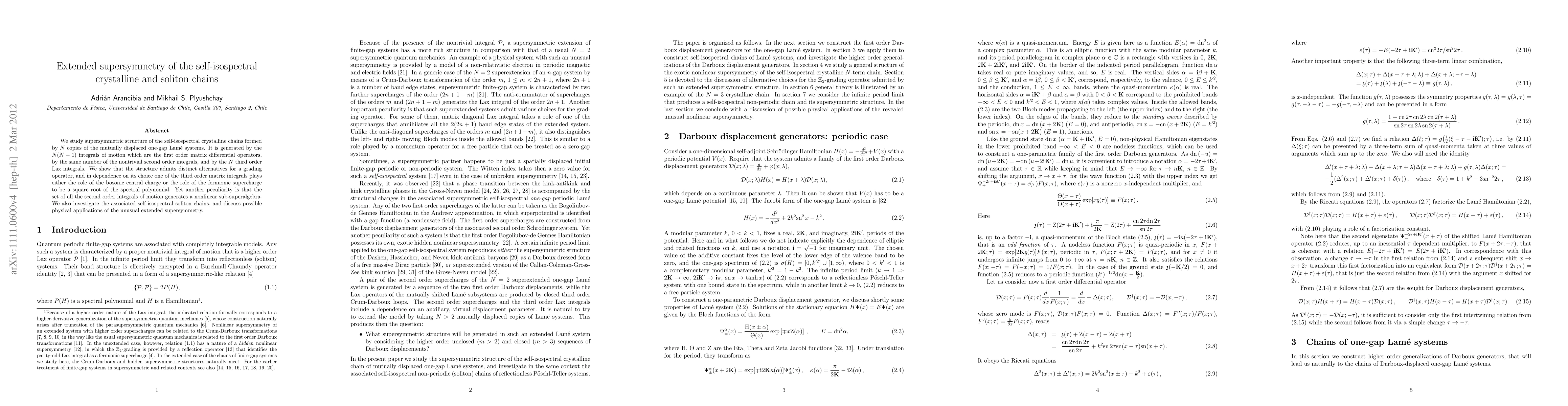 We study supersymmetric structure of the self-isospectral crystalline chains formed by N copies of the mutually displaced one-gap Lame systems. It is generated by the N(N-1) integrals of motion which are the first order matrix differential operators, by the same number of the nontrivial second order integrals, and by the N third order Lax integrals. We show that the structure admits distinct alternatives for a grading operator, and in dependence on its choice one of the third order matrix integrals plays either the role of the bosonic central charge or the role of the fermionic supercharge to be a square root of the spectral polynomial. Yet another peculiarity is that the set of all the second order integrals of motion generates a nonlinear sub-superalgebra. We also investigate the associated self-isospectral soliton chains, and discuss possible physical applications of the unusual extended supersymmetry.