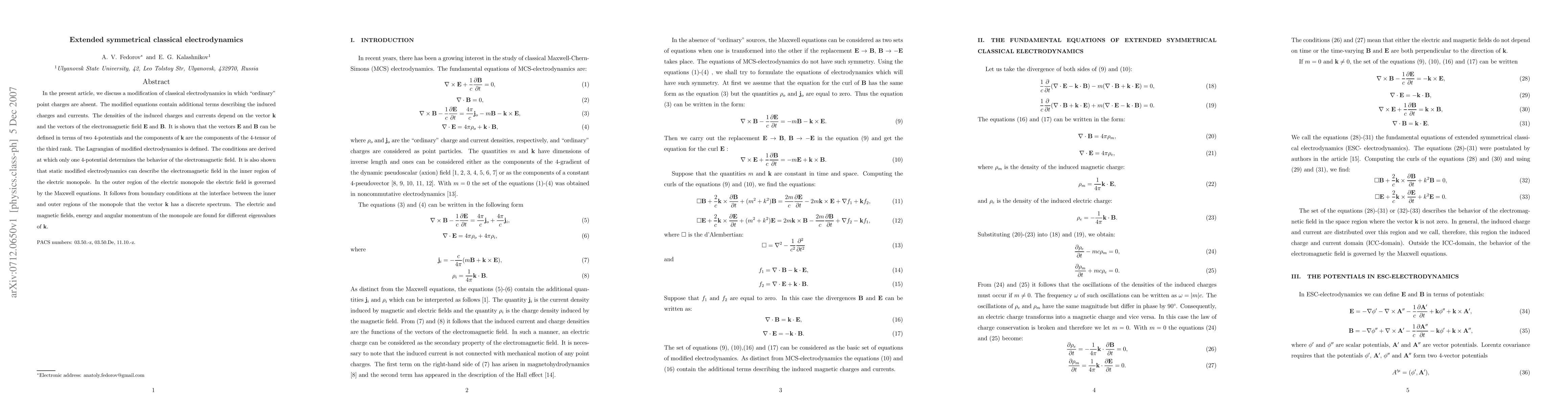 In the present article, we discuss a modification of classical electrodynamics in which ``ordinary'' point charges are absent. The modified equations contain additional terms describing the induced charges and currents. The densities of the induced charges and currents depend on the vector k and the vectors of the electromagnetic field E and B. It is shown that the vectors E and B can be defined in terms of two 4-potentials and the components of k are the components of the 4-tensor of the third rank. The Lagrangian of modified electrodynamics is defined. The conditions are derived at which only one 4-potential determines the behavior of the electromagnetic field. It is also shown that static modified electrodynamics can describe the electromagnetic field in the inner region of the electric monopole. In the outer region of the electric monopole the electric field is governed by the Maxwell equations. It follows from boundary conditions at the interface between the inner and outer regions of the monopole that the vector k has a discrete spectrum. The electric and magnetic fields, energy and angular momentum of the monopole are found for different eigenvalues of k.