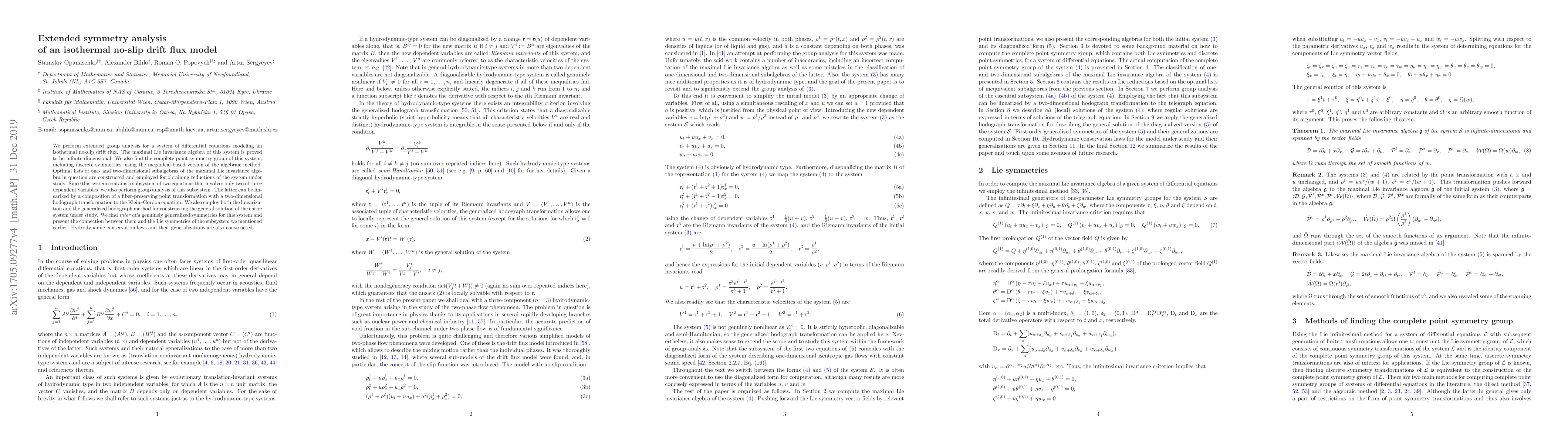 We perform extended group analysis for a system of differential equations modeling an isothermal no-slip drift flux. The maximal Lie invariance algebra of this system is proved to be infinite-dimensional. We also find the complete point symmetry group of this system, including discrete symmetries, using the megaideal-based version of the algebraic method. Optimal lists of one- and two-dimensional subalgebras of the maximal Lie invariance algebra in question are constructed and employed for obtaining reductions of the system under study. Since this system contains a subsystem of two equations that involves only two of three dependent variables, we also perform group analysis of this subsystem. The latter can be linearized by a composition of a fiber-preserving point transformation with a two-dimensional hodograph transformation to the Klein-Gordon equation. We also employ both the linearization and the generalized hodograph method for constructing the general solution of the entire system under study. We find inter alia genuinely generalized symmetries for this system and present the connection between them and the Lie symmetries of the subsystem we mentioned earlier. Hydrodynamic conservation laws and their generalizations are also constructed.