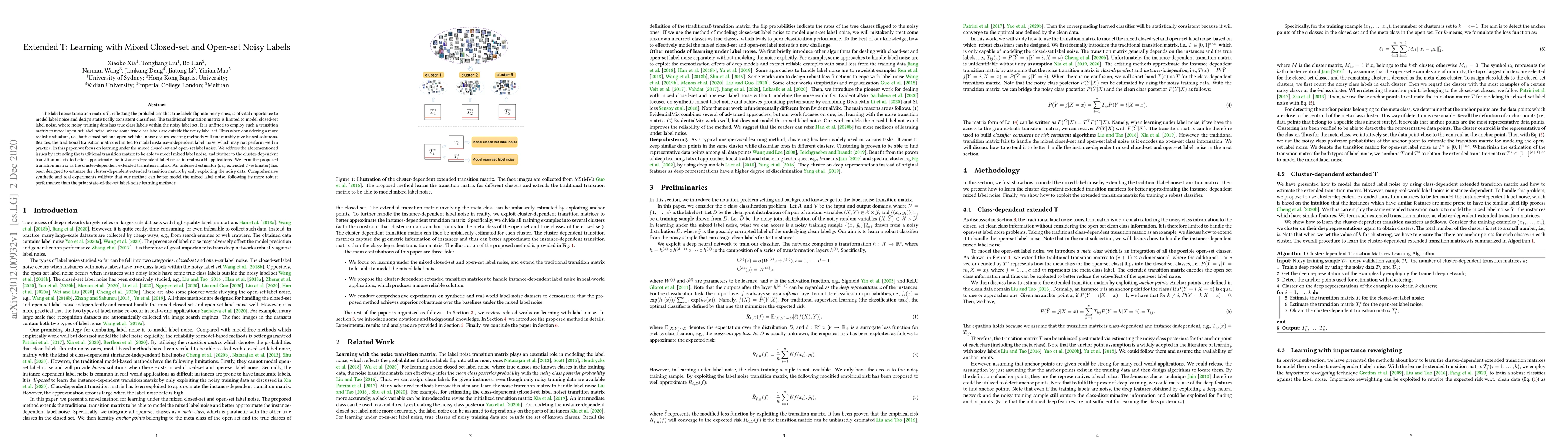 This paper proposes an extended transition matrix to model mixed closed-set and open-set label noise, addressing limitations of traditional methods. The cluster-dependent extended transition matrix and an associated unbiased estimator improve the handling of instance-dependent label noise, leading to better performance in noisy label learning tasks.