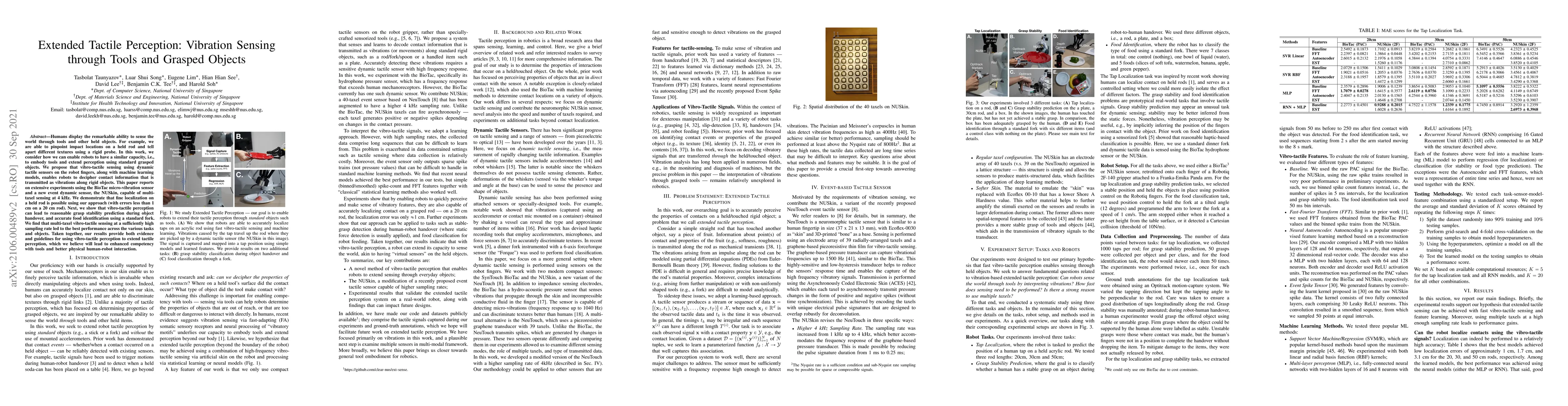 This paper explores enabling robots to extend tactile perception through tools and grasped objects using vibro-tactile sensing and dynamic tactile sensors. Experiments show that robots can accurately localize impacts and identify objects, suggesting enhanced competency in tool use and improved human-robot interaction.