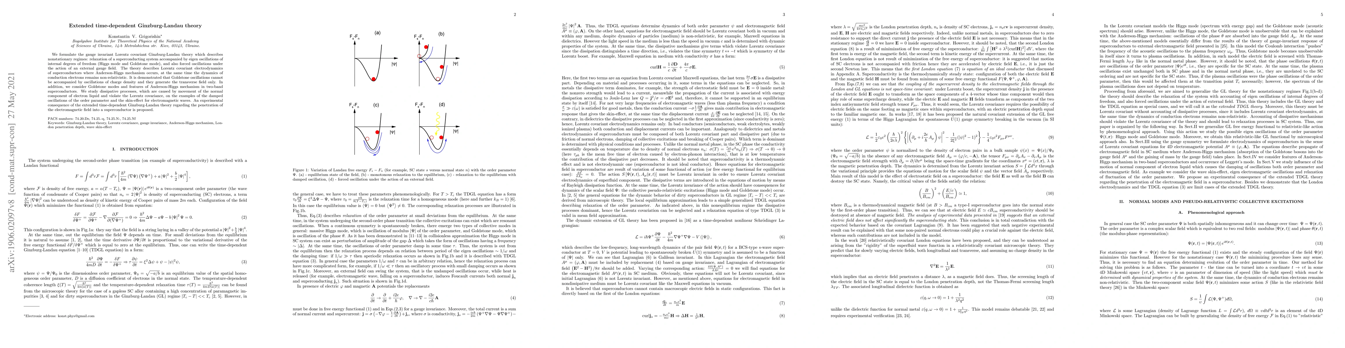 We formulate the gauge invariant Lorentz covariant Ginzburg-Landau theory which describes nonstationary regimes: relaxation of a superconducting system accompanied by eigen oscillations of internal degrees of freedom (Higgs mode and Goldstone mode), and also forced oscillations under the action of an external gauge field. The theory describes Lorentz covariant electrodynamics of superconductors where Anderson-Higgs mechanism occurs, at the same time the dynamics of conduction electrons remains non-relativistic. It is demonstrated that Goldstone oscillations cannot be accompanied by oscillations of charge density and they generate the transverse field only. In addition, we consider Goldstone modes and features of Anderson-Higgs mechanism in two-band superconductors. We study dissipative processes, which are caused by movement of the normal component of electron liquid and violate the Lorentz covariance, on the examples of the damped oscillations of the order parameter and the skin-effect for electromagnetic waves. An experimental consequence of the extended time-dependent Ginzburg-Landau theory regarding the penetration of the electromagnetic field into a superconductor is proposed.