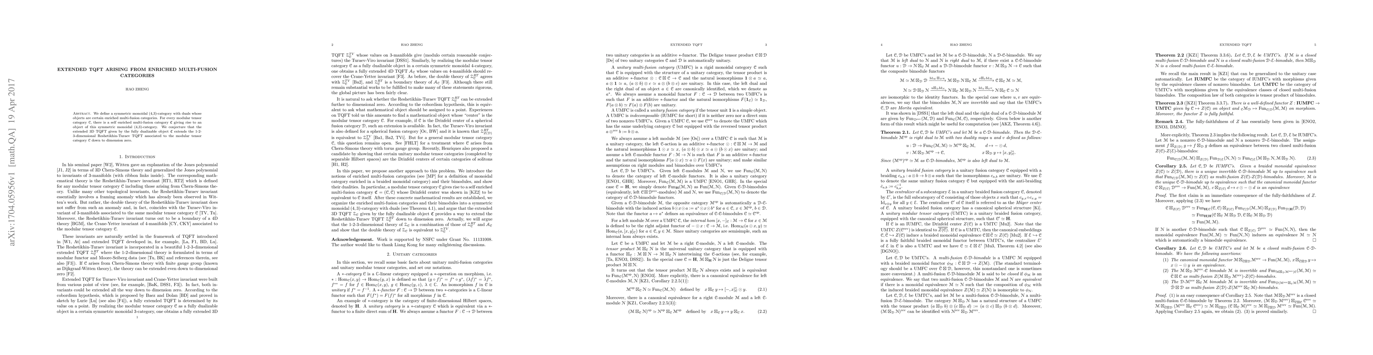 The paper introduces a symmetric monoidal (4,3)-category with duals, using enriched multi-fusion categories as objects. It conjectures that a specific extended 3D TQFT, derived from a self-enriched multi-fusion category associated with any modular tensor category, extends the Reshetikhin-Turaev TQFT to dimension zero.