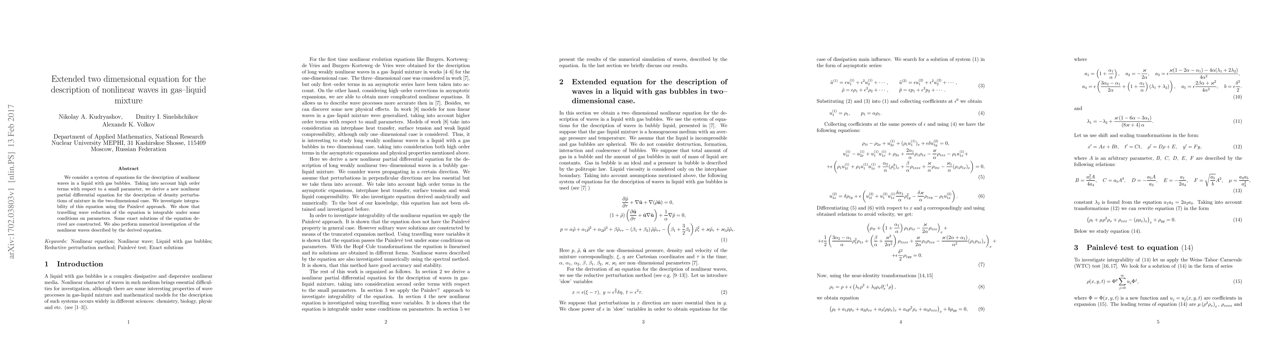 We consider a system of equations for the description of nonlinear waves in a liquid with gas bubbles. Taking into account high order terms with respect to a small parameter, we derive a new nonlinear partial differential equation for the description of density perturbations of mixture in the two-dimensional case. We investigate integrability of this equation using the Painlev\'e approach. We show that travelling wave reduction of the equation is integrable under some conditions on parameters. Some exact solutions of the equation derived are constructed. We also perform numerical investigation of the nonlinear waves described by the derived equation.