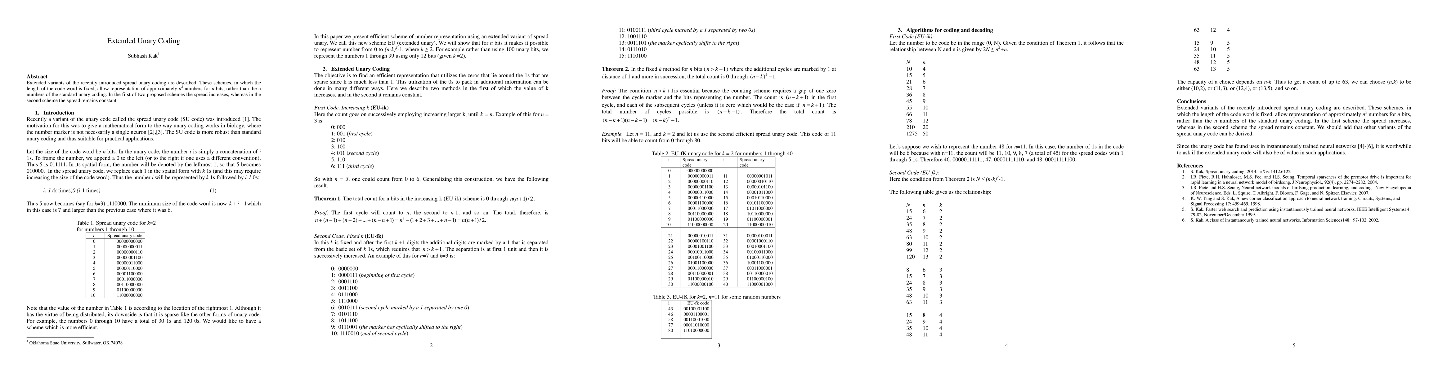Summary: This paper introduces extended variants of spread unary coding that allow representation of approximately n^2 numbers using n bits, with one scheme increasing the spread and the other maintaining a constant spread.