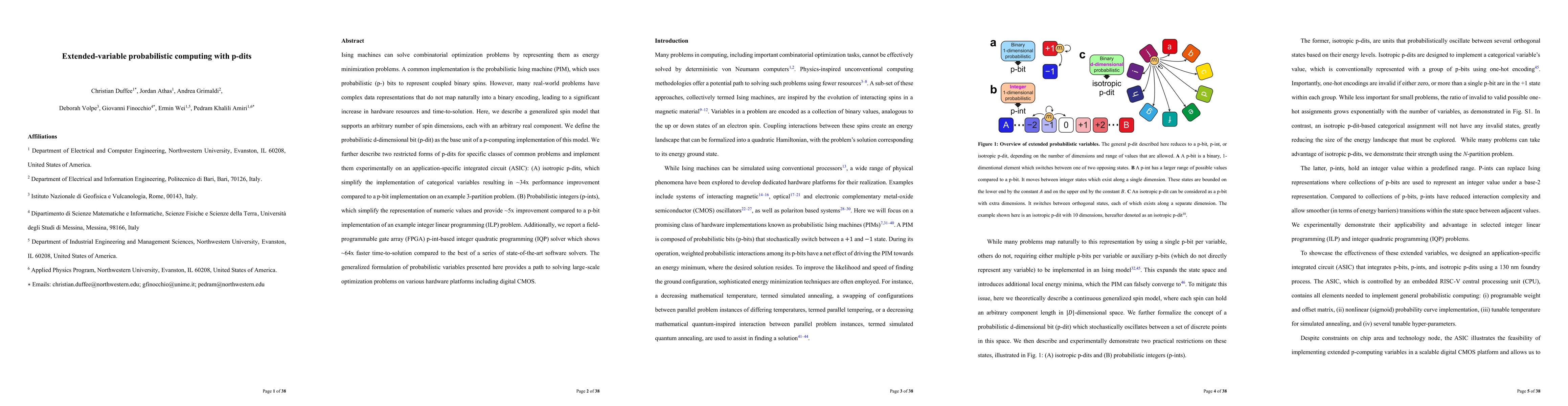 Ising machines can solve combinatorial optimization problems by representing them as energy minimization problems. A common implementation is the probabilistic Ising machine (PIM), which uses probabilistic (p-) bits to represent coupled binary spins. However, many real-world problems have complex data representations that do not map naturally into a binary encoding, leading to a significant increase in hardware resources and time-to-solution. Here, we describe a generalized spin model that supports an arbitrary number of spin dimensions, each with an arbitrary real component. We define the probabilistic d-dimensional bit (p-dit) as the base unit of a p-computing implementation of this model. We further describe two restricted forms of p-dits for specific classes of common problems and implement them experimentally on an application-specific integrated circuit (ASIC): (A) isotropic p-dits, which simplify the implementation of categorical variables resulting in ~34x performance improvement compared to a p-bit implementation on an example 3-partition problem. (B) Probabilistic integers (p-ints), which simplify the representation of numeric values and provide ~5x improvement compared to a p-bit implementation of an example integer linear programming (ILP) problem. Additionally, we report a field-programmable gate array (FPGA) p-int-based integer quadratic programming (IQP) solver which shows ~64x faster time-to-solution compared to the best of a series of state-of-the-art software solvers. The generalized formulation of probabilistic variables presented here provides a path to solving large-scale optimization problems on various hardware platforms including digital CMOS.