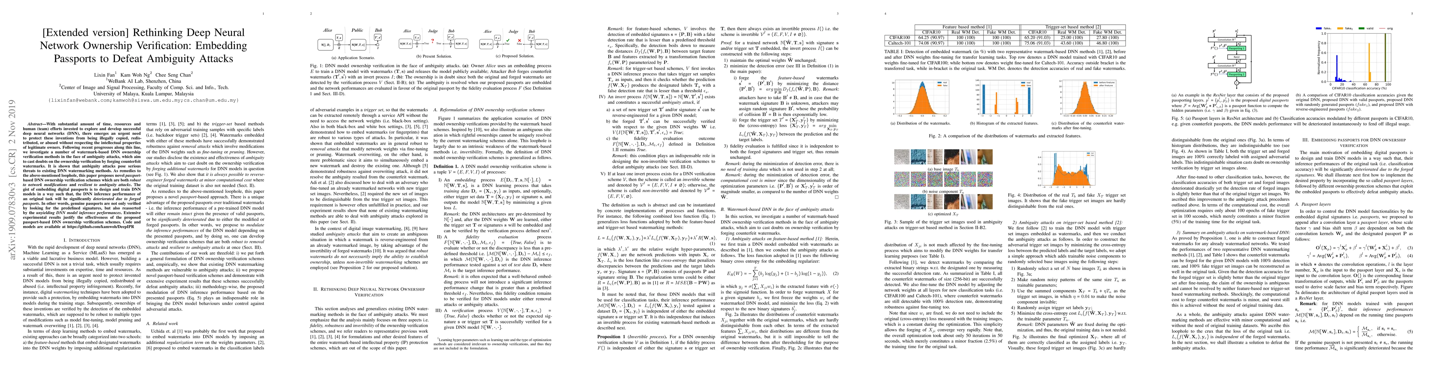 This paper proposes novel passport-based DNN ownership verification methods to counter ambiguity attacks that forge counterfeit watermarks, ensuring robust protection against illegal copying and redistribution of DNN models. The proposed schemes are resilient to network modifications and verified through DNN inference performance, not just predefined signatures.