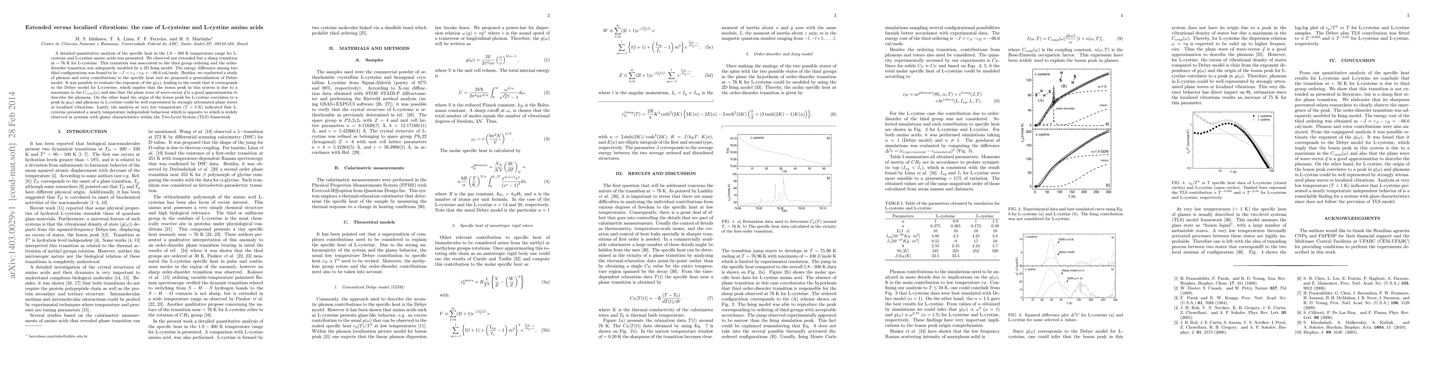 A detailed quantitative analysis of the specific heat in the $1.8-300$ K temperature range for L-cysteine and L-cystine amino acids was presented. We observed not extended but a sharp transition at $\sim 76$ K for L-cysteine. This transition was associated to the thiol group ordering and the order-disorder transition was adequately modeled by a 2D Ising model. The energy difference among two thiol configurations was found to be $-J=\varepsilon_{A}-\varepsilon_{B}=-66.6$ cal/mole. Besides, we conducted a study of phonon and rotor contributions to the specific heat and we proposed a generalization of Debye model. It was possible to evaluate the exponent of the $g(\omega)$, leading to the result that it corresponds to the Debye model for L-cysteine, which implies that the boson peak in this system is due to a maximum in the $C_{coup}(\omega)$ and also that the plane wave of wave-vector $\vec{q}$ is a good approximation to describe the phonons. On the other hand the origin of the boson peak for L-cystine correlates to a peak in $g(\omega)$ and phonons in L-cystine could be well represented by strongly attenuated plane waves or localized vibrations. Lastly, the analysis at very low temperature ($T<3$ K) indicated that L-cysteine presented a nearly temperature independent behaviour which is opposite to which is widely observed in systems with glassy characteristics within the Two-Level System (TLS) framework.