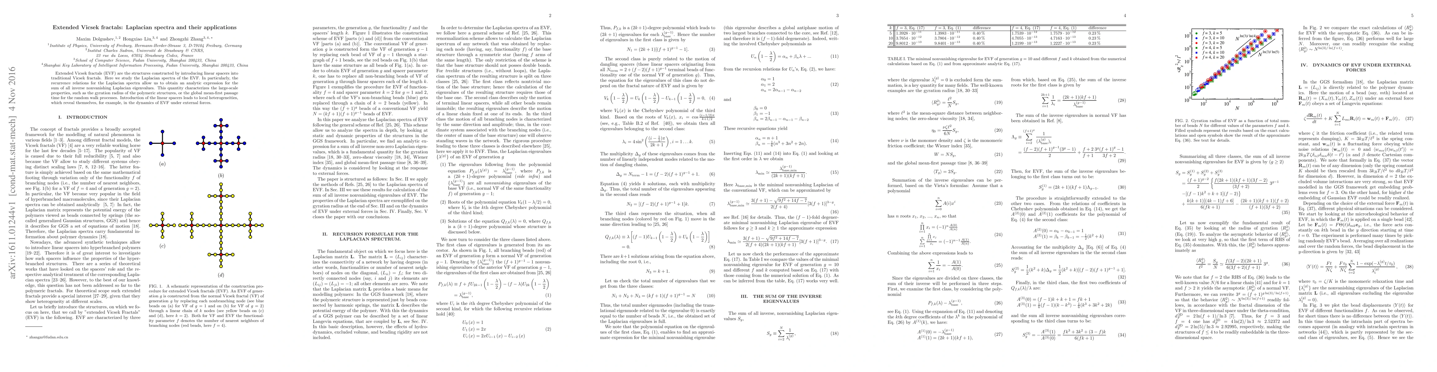 This paper investigates the Laplacian spectra of extended Vicsek fractals (EVF), revealing analytic expressions for the sum of inverse nonvanishing Laplacian eigenvalues. These spectra characterize large-scale properties and dynamics, such as gyration radius and random walk processes, highlighting the impact of linear spacers on local heterogeneities.