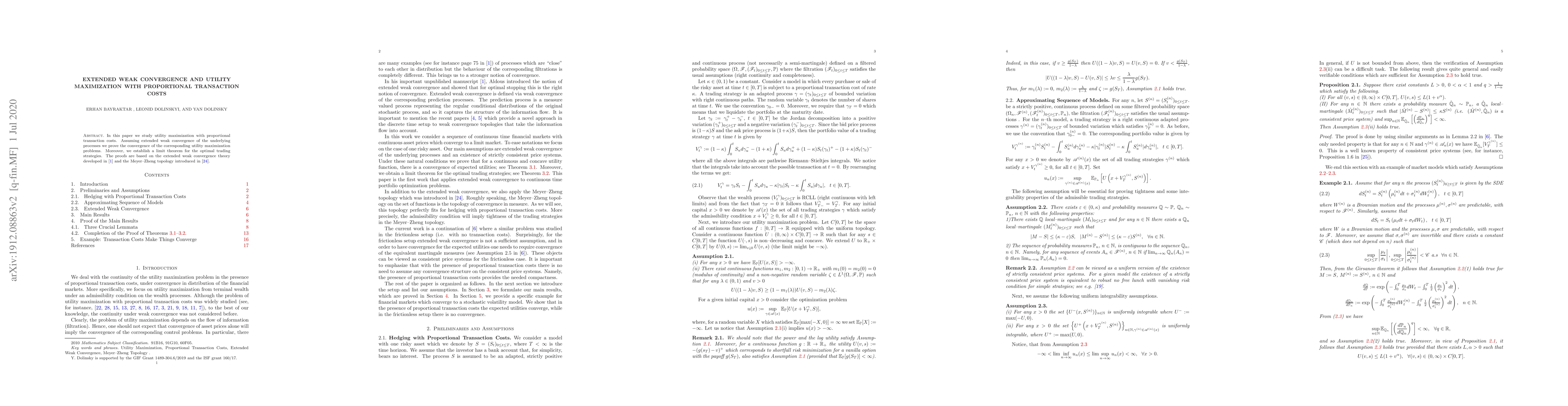 This paper investigates utility maximization under proportional transaction costs, proving convergence of the utility maximization problems through extended weak convergence of underlying processes. It also establishes a limit theorem for optimal trading strategies, leveraging extended weak convergence theory and the Meyer-Zheng topology.