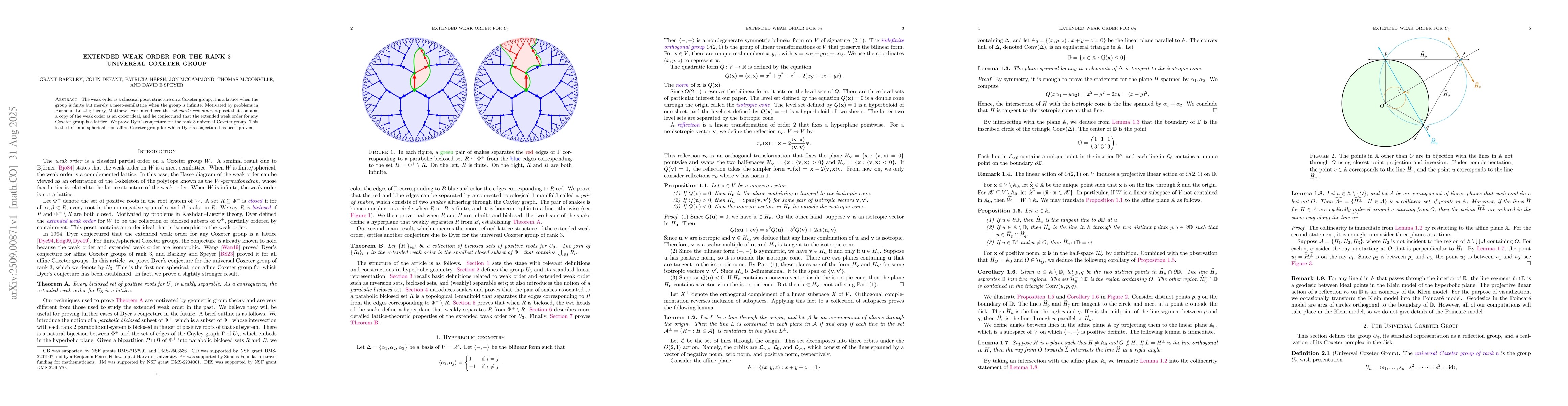 The weak order is a classical poset structure on a Coxeter group; it is a lattice when the group is finite but merely a meet-semilattice when the group is infinite. Motivated by problems in Kazhdan--Lusztig theory, Matthew Dyer introduced the extended weak order, a poset that contains a copy of the weak order as an order ideal, and he conjectured that the extended weak order for any Coxeter group is a lattice. We prove Dyer's conjecture for the rank 3 universal Coxeter group. This is the first non-spherical, non-affine Coxeter group for which Dyer's conjecture has been proven.