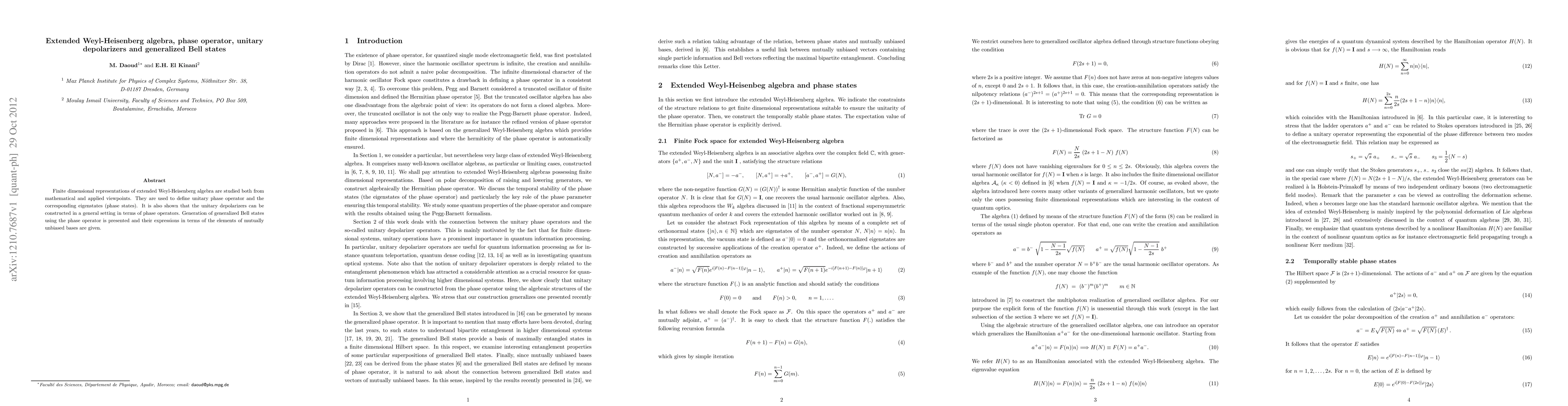 The paper explores finite dimensional representations of the extended Weyl-Heisenberg algebra to define a unitary phase operator and its eigenstates, demonstrating the construction of unitary depolarizers using phase operators. It also introduces the generation of generalized Bell states through the phase operator and provides their expressions in terms of mutually unbiased bases.