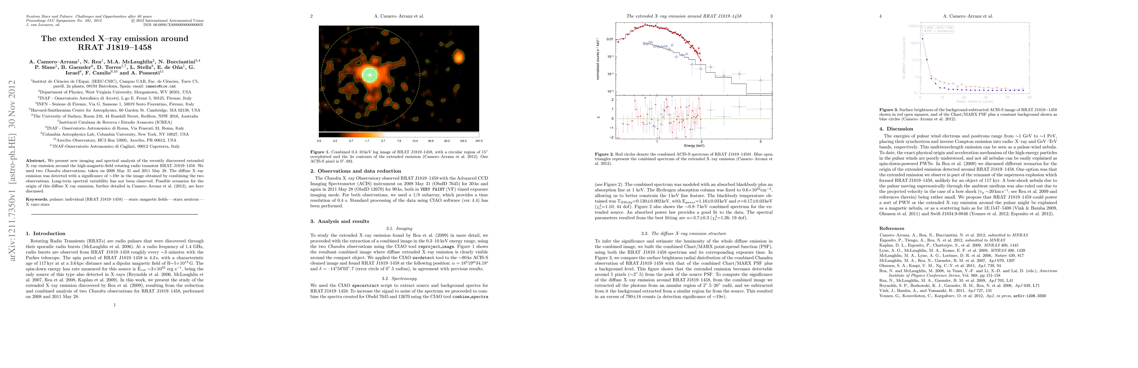 We present new imaging and spectral analysis of the recently discovered extended X-ray emission around the high-magnetic-field rotating radio transient RRAT J1819-1458. We used two Chandra observations, taken on 2008 May 31 and 2011 May 28. The diffuse X-ray emission was detected with a significance of ~19sigma in the image obtained by combining the two observations. Long-term spectral variability has not been observed. Possible scenarios for the origin of this diffuse X-ray emission, further detailed in Camero-Arranz et al. (2012), are here discussed.
