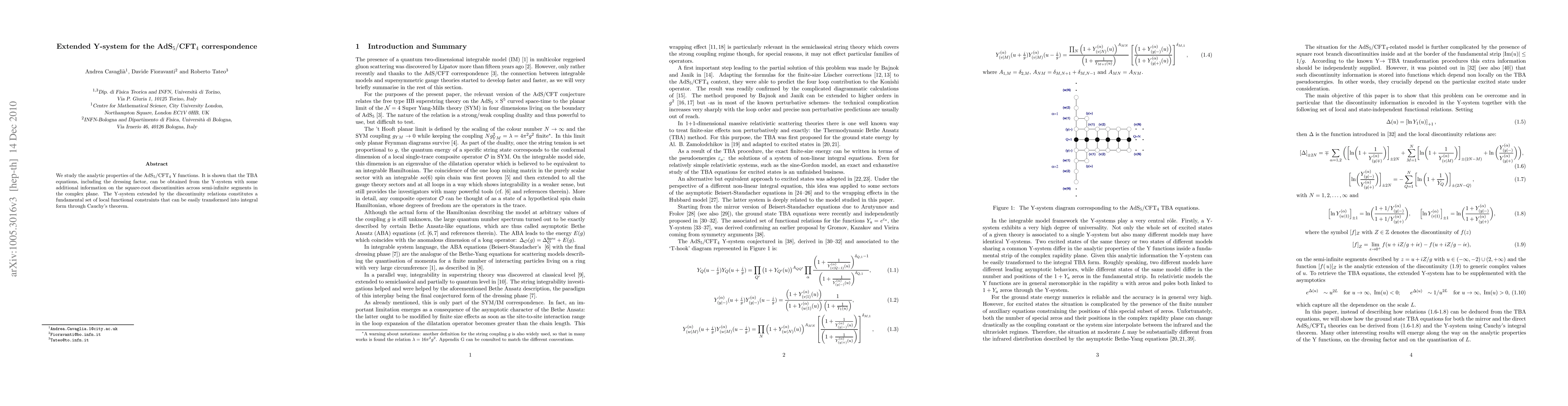 This research explores the analytic properties of the Y functions in the $AdS_5/CFT_4$ correspondence, demonstrating how the thermodynamic Bethe ansatz (TBA) equations can be derived from the extended Y-system, incorporating specific information on square-root discontinuities. The extended Y-system provides a set of local functional constraints convertible to integral form via Cauchy's theorem.