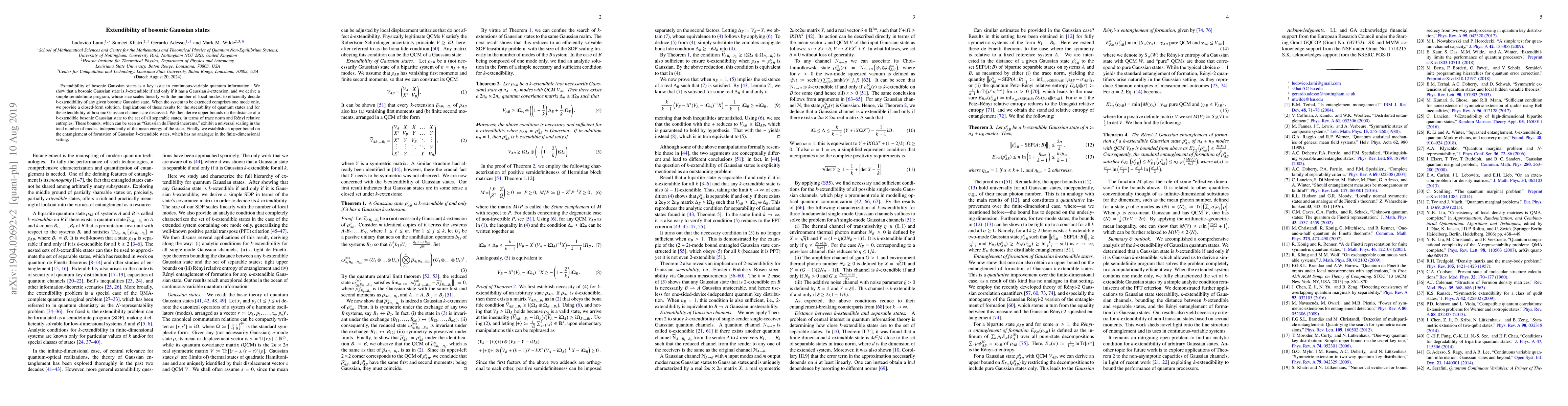 The paper investigates the extendibility of bosonic Gaussian states and provides a semidefinite program to determine $k$-extendibility efficiently. It also establishes universal scaling bounds for the distance to separable states and an upper bound on the entanglement of formation for Gaussian $k$-extendible states.