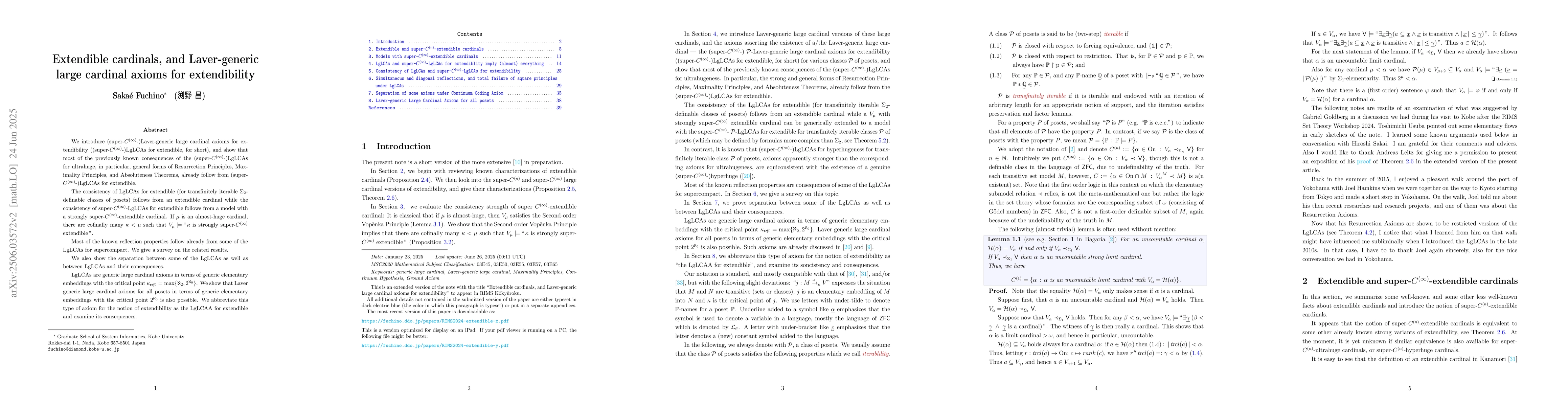 The paper introduces (super-$C^{(\infty)}$-)Laver-generic large cardinal axioms for extendibility (LgLCAs for extendible), demonstrating that many consequences of LgLCAs for ultrahuge, such as Resurrection Principles, Maximality Principles, and Absoluteness Theorems, follow from LgLCAs for extendible.