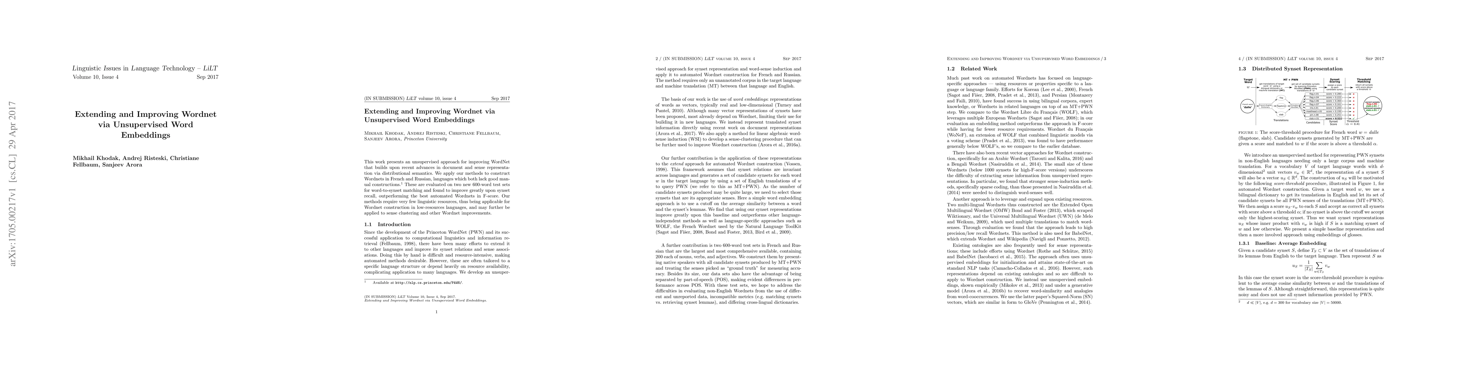 This work presents an unsupervised approach for improving WordNet that builds upon recent advances in document and sense representation via distributional semantics. We apply our methods to construct Wordnets in French and Russian, languages which both lack good manual constructions.1 These are evaluated on two new 600-word test sets for word-to-synset matching and found to improve greatly upon synset recall, outperforming the best automated Wordnets in F-score. Our methods require very few linguistic resources, thus being applicable for Wordnet construction in low-resources languages, and may further be applied to sense clustering and other Wordnet improvements.