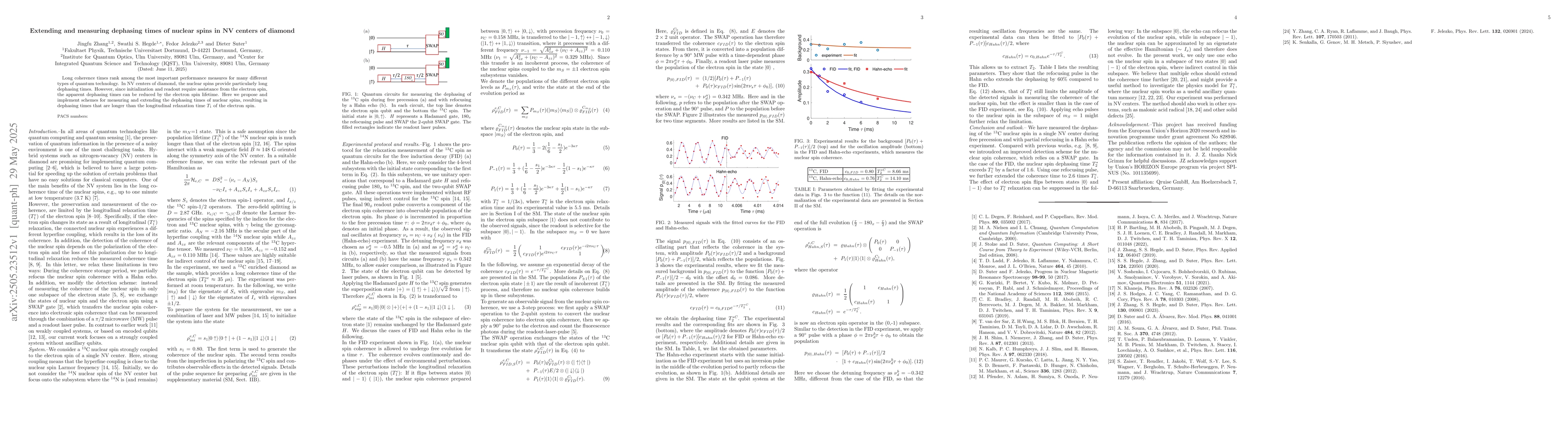 The research proposes and implements schemes for measuring and extending the dephasing times of nuclear spins in NV centers of diamond, utilizing quantum circuits for free induction decay (FID) and Hahn-echo experiments.