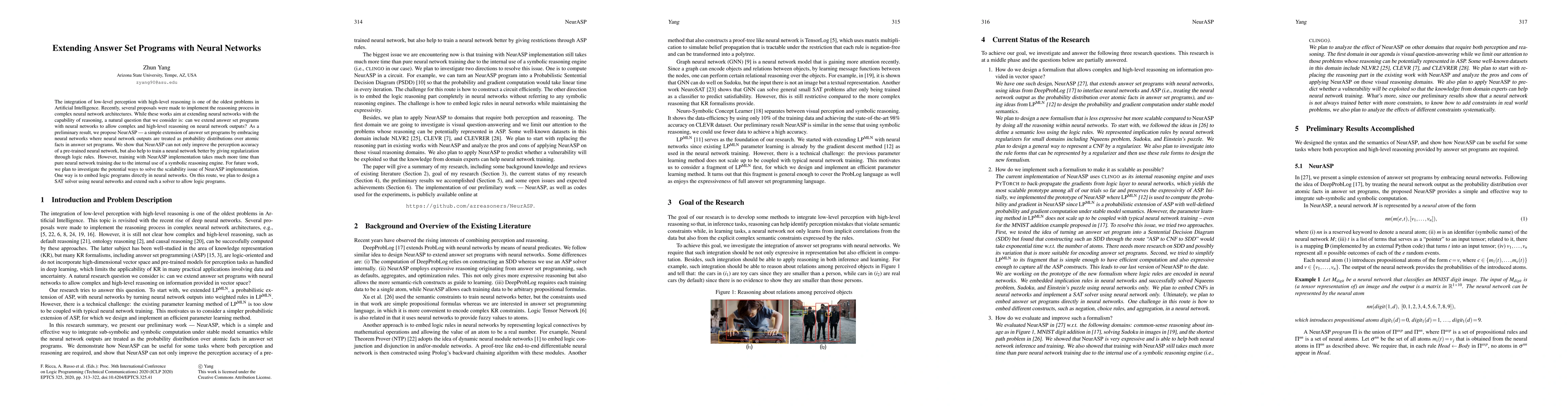 This paper proposes NeurASP, an extension of answer set programs that incorporates neural networks to enhance both perception accuracy and reasoning capabilities. NeurASP treats neural network outputs as probability distributions, but faces scalability issues due to the use of a symbolic reasoning engine.