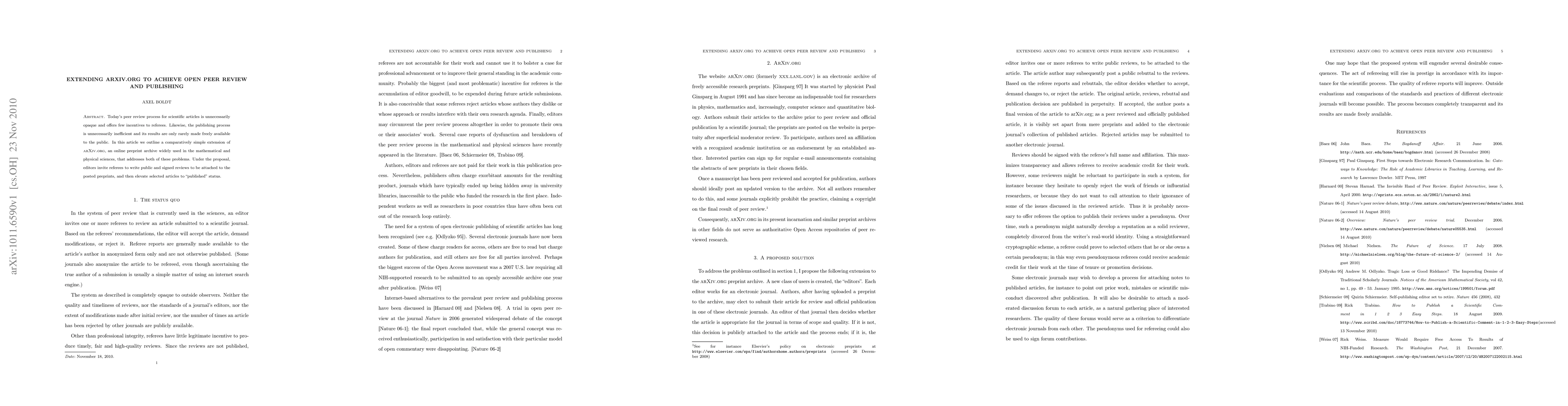 This paper proposes an extension to ArXiv.org for open peer review and publishing, inviting referees to write public, signed reviews attached to preprints. Editors then elevate selected articles to 'published' status, addressing opacity in peer review and inefficiency in publishing, while promoting public access to scientific articles.
