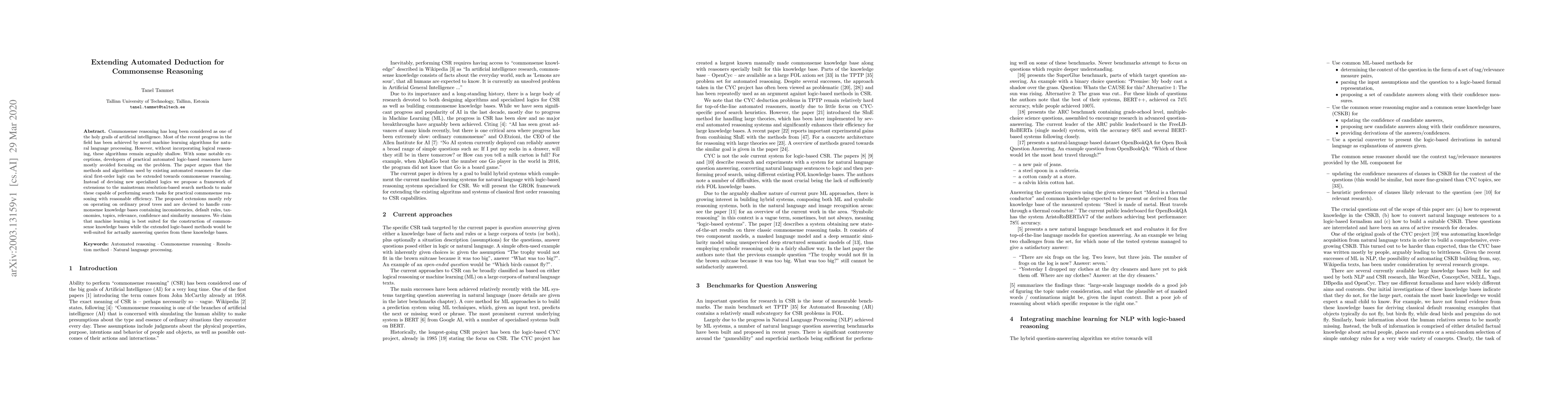 This paper proposes extending automated deduction methods for classical first-order logic to enhance commonsense reasoning, aiming to incorporate logical reasoning into machine learning algorithms. The authors suggest using resolution-based search methods with extensions to handle commonsense knowledge bases, including inconsistencies and default rules, to achieve practical and efficient reasoning.