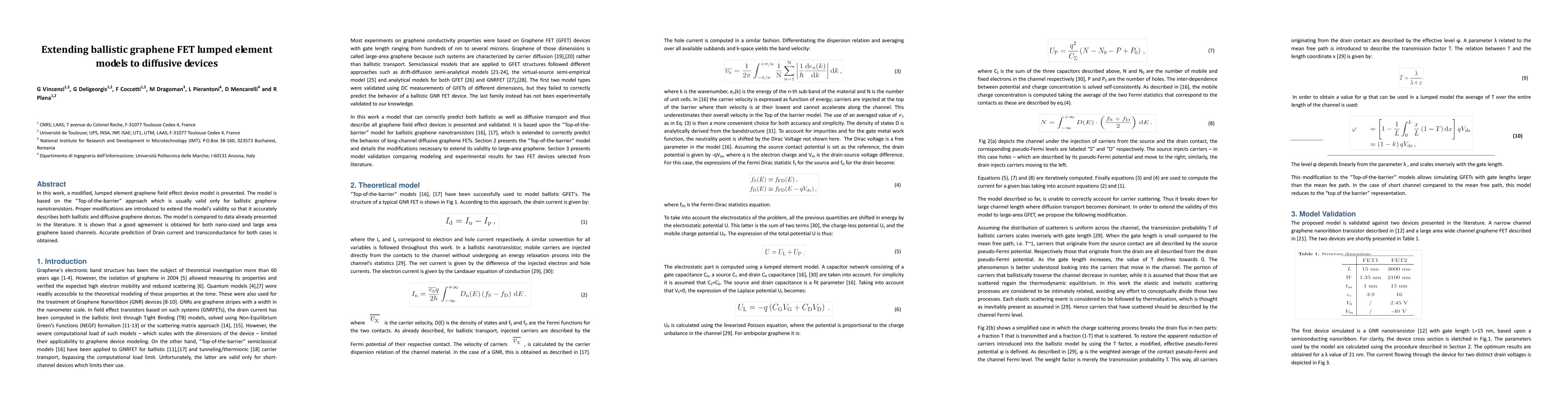 In this work, a modified, lumped element graphene field effect device model is presented. The model is based on the "Top-of-the-barrier" approach which is usually valid only for ballistic graphene nanotransistors. Proper modifications are introduced to extend the model's validity so that it accurately describes both ballistic and diffusive graphene devices. The model is compared to data already presented in the literature. It is shown that a good agreement is obtained for both nano-sized and large area graphene based channels. Accurate prediction of drain current and transconductance for both cases is obtained.