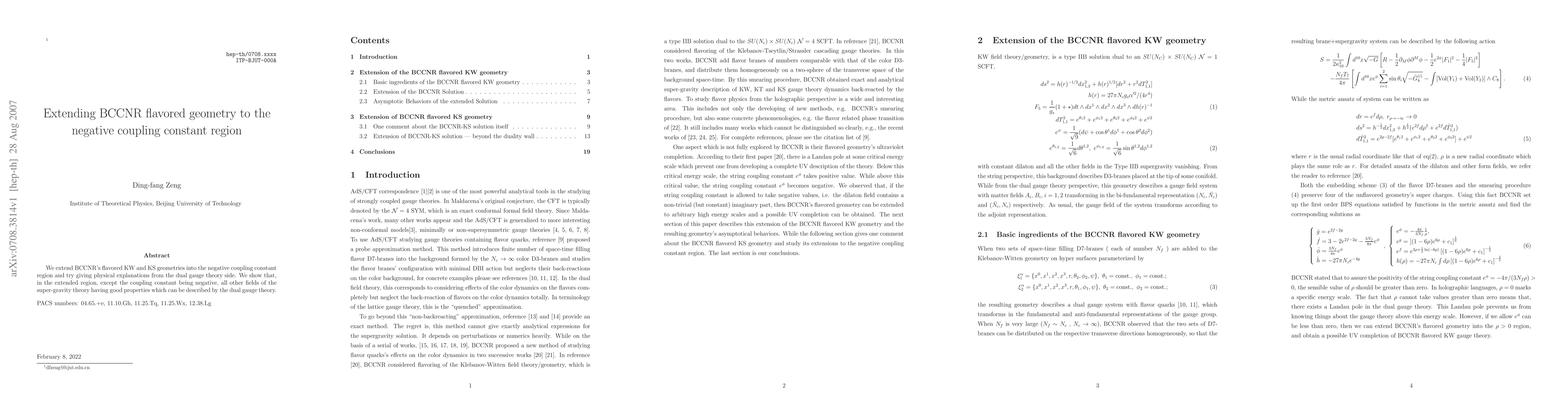 We extend BCCNR's flavored KW and KS geometries into the negative coupling constant region and try giving physical explanations from the dual gauge theory side. We show that, in the extended region, except the coupling constant being negative, all other fields of the super-gravity theory having good properties which can be described by the dual gauge theory.