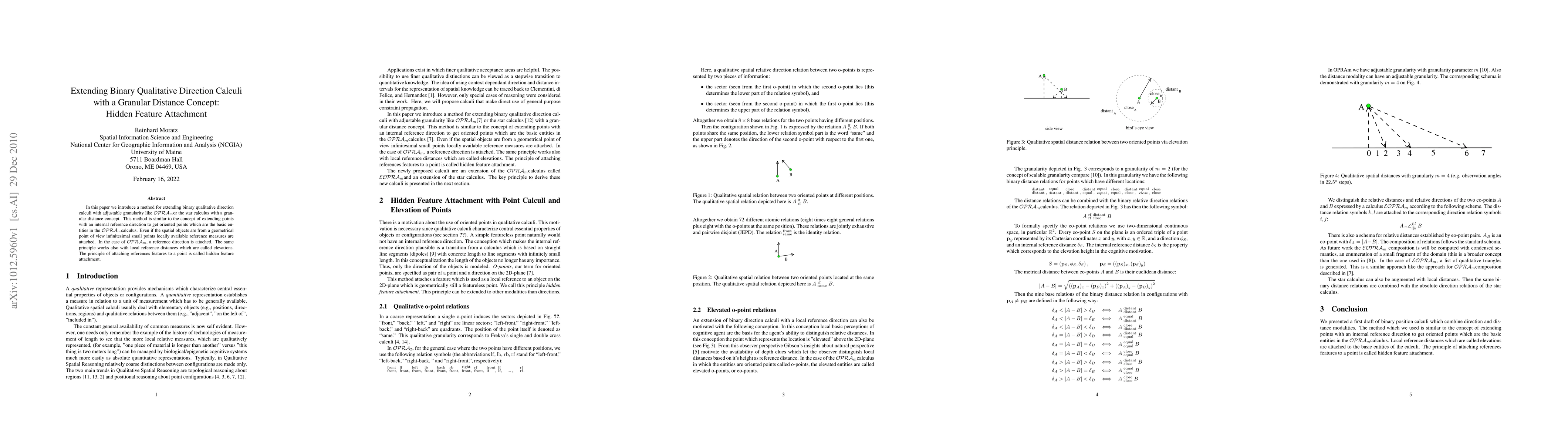 This paper proposes a method to extend binary qualitative direction calculi, such as OPRAm, by incorporating granular distance concepts, akin to attaching internal reference directions to points. This "hidden feature attachment" involves adding locally available reference measures, like reference directions or distances, to infinitesimal spatial objects.