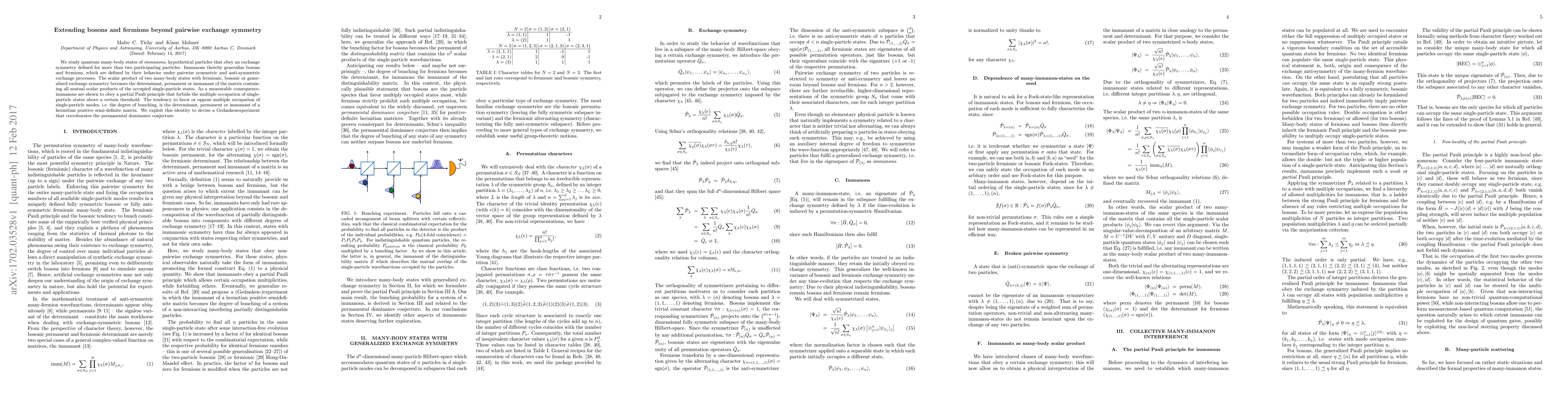 We study quantum many-body states of immanons, hypothetical particles that obey an exchange symmetry defined for more than two participating particles. Immanons thereby generalize bosons and fermions, which are defined by their behavior under pairwise symmetric and anti-symmetric exchange processes. The scalar product of two many-body states with fermionic, bosonic or generalized exchange symmetry becomes the determinant, permanent or immanant of the matrix containing all mutual scalar products of the occupied single-particle states. As a measurable consequence, immanons are shown to obey a partial Pauli principle that forbids the multiple occupation of single-particle states above a certain threshold. The tendency to favor or oppose multiple occupation of single-particle modes, i.e. the degree of bunching, is the determinant, permanent or immanant of a hermitian positive semi-definite matrix. We exploit this identity to devise a Gedankenexperiment that corroborates the permanental dominance conjecture.