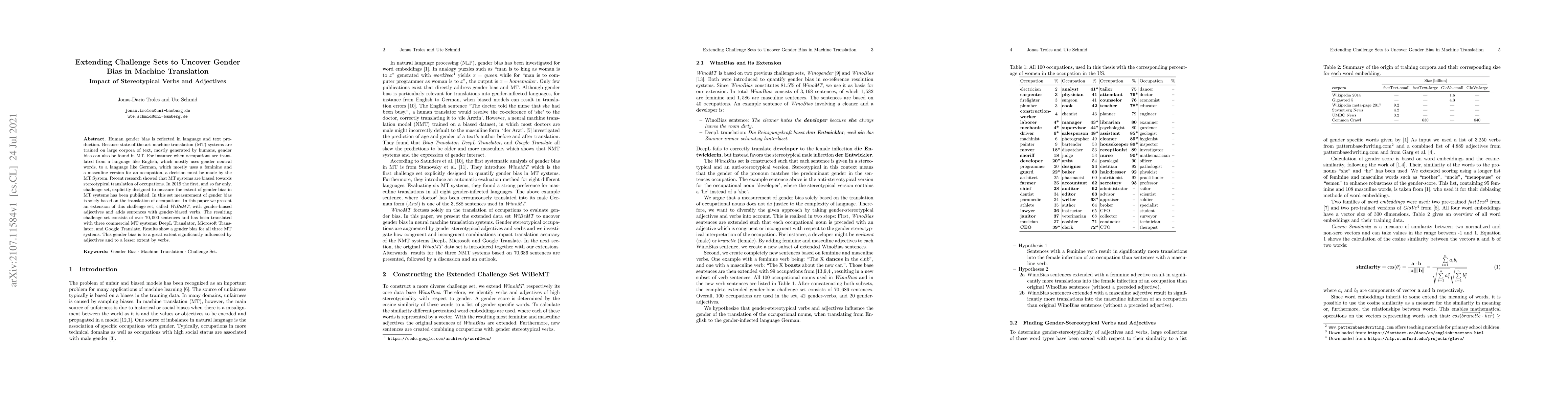 Human gender bias is reflected in language and text production. Because state-of-the-art machine translation (MT) systems are trained on large corpora of text, mostly generated by humans, gender bias can also be found in MT. For instance when occupations are translated from a language like English, which mostly uses gender neutral words, to a language like German, which mostly uses a feminine and a masculine version for an occupation, a decision must be made by the MT System. Recent research showed that MT systems are biased towards stereotypical translation of occupations. In 2019 the first, and so far only, challenge set, explicitly designed to measure the extent of gender bias in MT systems has been published. In this set measurement of gender bias is solely based on the translation of occupations. In this paper we present an extension of this challenge set, called WiBeMT, with gender-biased adjectives and adds sentences with gender-biased verbs. The resulting challenge set consists of over 70, 000 sentences and has been translated with three commercial MT systems: DeepL Translator, Microsoft Translator, and Google Translate. Results show a gender bias for all three MT systems. This gender bias is to a great extent significantly influenced by adjectives and to a lesser extent by verbs.