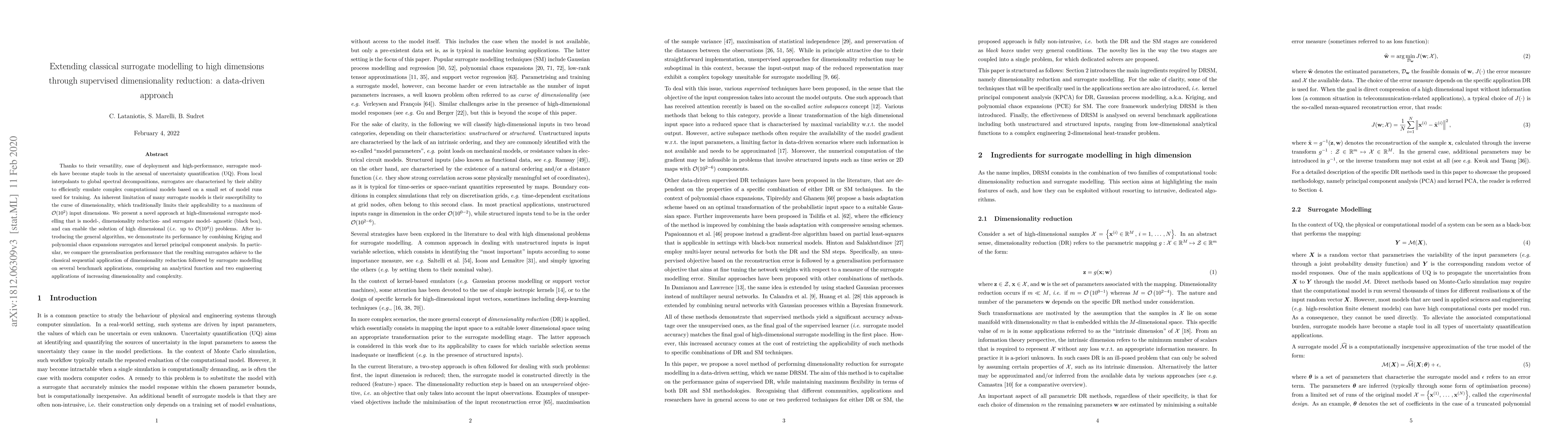 This paper introduces a novel data-driven approach combining supervised dimensionality reduction with surrogate modelling to extend the applicability of surrogate models to high-dimensional problems, up to $\mathcal{O}(10^4)$ input dimensions. The proposed method integrates Kriging, polynomial chaos expansions, and kernel principal component analysis, demonstrating improved performance compared to traditional sequential dimensionality reduction and surrogate modelling.