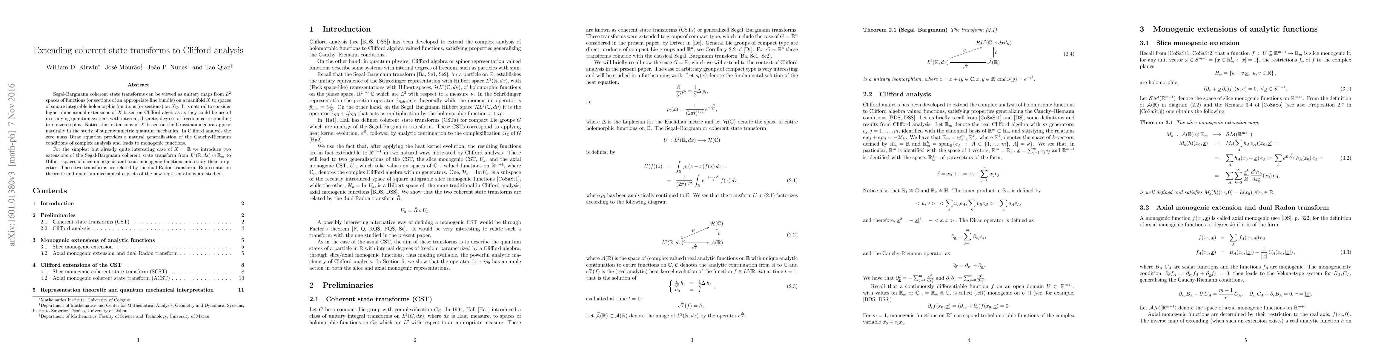 We introduce two extensions of the Segal-Bargmann coherent state transform from $L^2({\mathbb R},dx)$ to Hilbert spaces of slice monogenic and axial monogenic functions and study their properties. These two transforms are related by the dual Radon transform. Representation theoretic and quantum mechanical aspects of the new representations are studied.