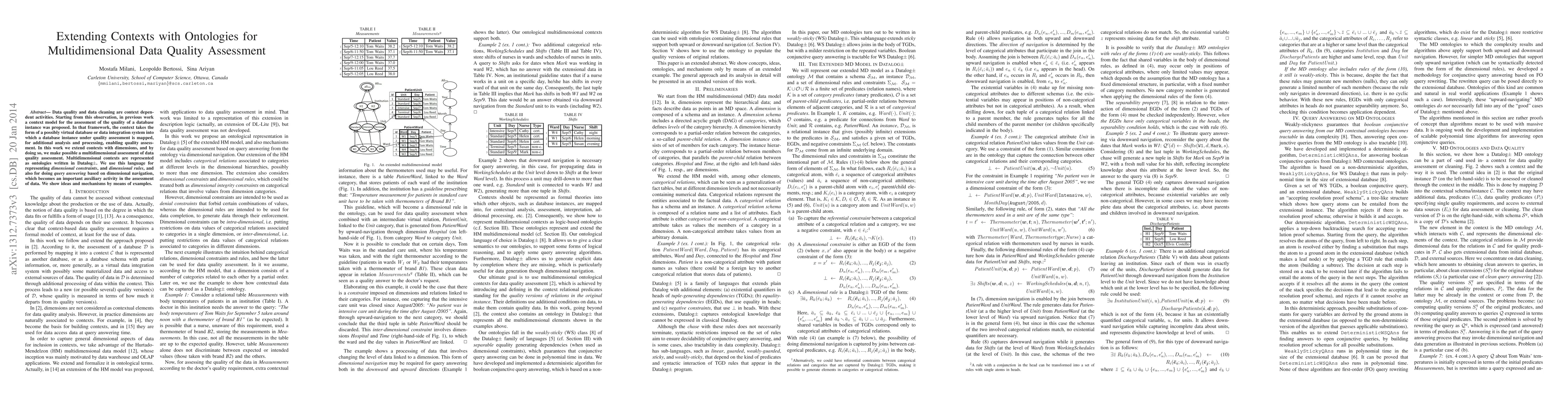 This research extends context models for data quality assessment to include dimensions, represented as ontologies, enabling multidimensional assessments of data quality. It proposes a new framework for representing dimensional constraints and rules using Datalog+-based ontologies.