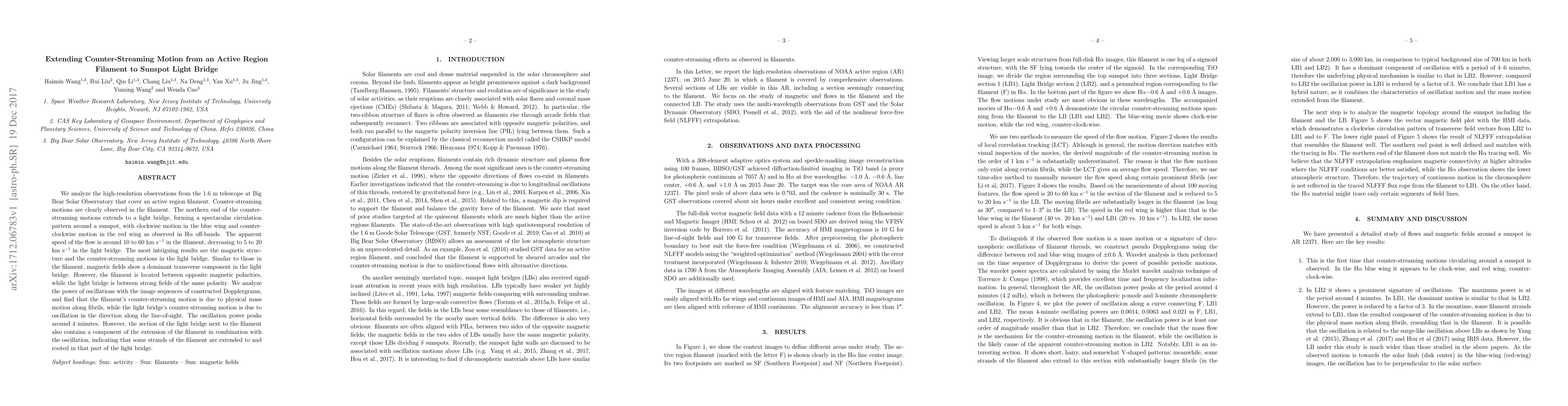 We analyze the high-resolution observations from the 1.6m telescope at Big Bear Solar Observatory that cover an active region filament. Counter-streaming motions are clearly observed in the filament. The northern end of the counter-streaming motions extends to a light bridge, forming a spectacular circulation pattern around a sunspot, with clockwise motion in the blue wing and counterclockwise motion in the red wing as observed in Halpha off-bands. The apparent speed of the flow is around 10 to 60 km/s in the filament, decreasing to 5 to 20 km/s in the light bridge. The most intriguing results are the magnetic structure and the counter-streaming motions in the light bridge. Similar to those in the filament, magnetic fields show a dominant transverse component in the light bridge. However, the filament is located between opposite magnetic polarities, while the light bridge is between strong fields of the same polarity. We analyze the power of oscillations with the image sequences of constructed Dopplergrams, and find that the filament's counter-streaming motion is due to physical mass motion along fibrils, while the light bridge's counter-streaming motion is due to oscillation in the direction along the line-of-sight. The oscillation power peaks around 4 minutes. However, the section of the light bridge next to the filament also contains a component of the extension of the filament in combination with the oscillation, indicating that some strands of the filament are extended to and rooted in that part of the light bridge.