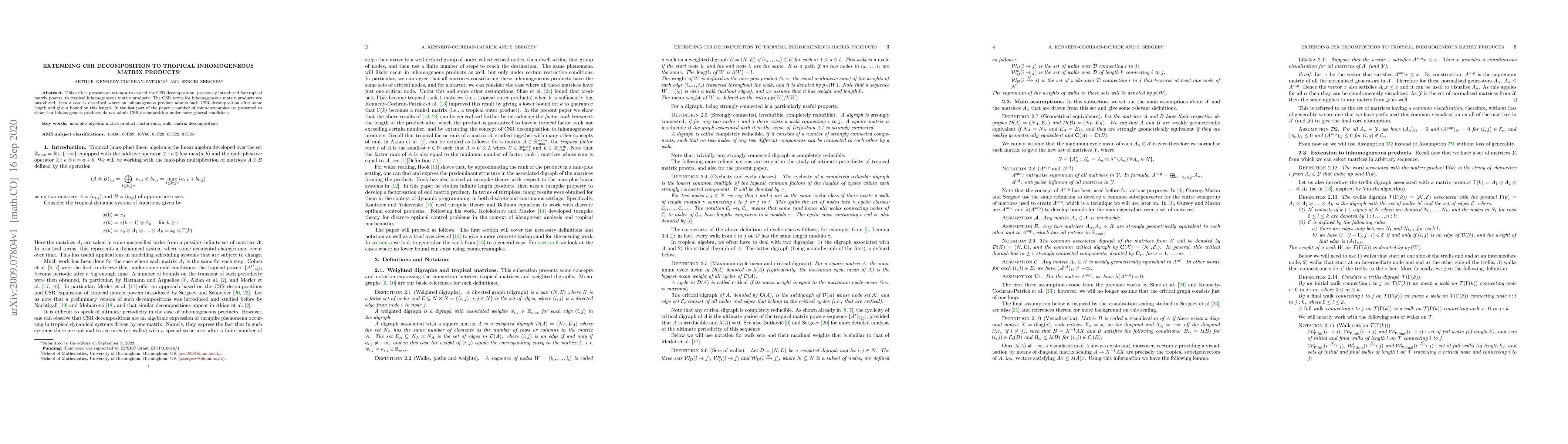 This article presents an attempt to extend the CSR decomposition, previously introduced for tropical matrix powers, to tropical inhomogeneous matrix products. The CSR terms for inhomogeneous matrix products are introduced, then a case is described where an inhomogeneous product admits such CSR decomposition after some length and give a bound on this length. In the last part of the paper a number of counterexamples are presented to show that inhomogeneous products do not admit CSR decomposition under more general conditions.