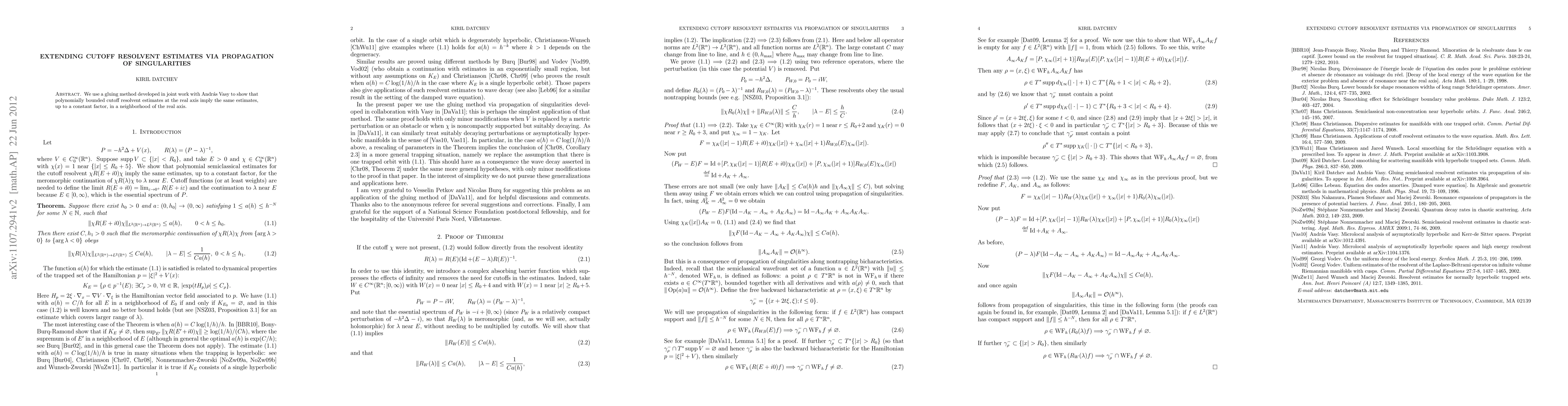 Summary: This paper employs a gluing method to extend cutoff resolvent estimates from the real axis to a neighborhood around it, leveraging joint work with András Vasy to achieve polynomially bounded results. The propagation of singularities is a key technique used in this extension.