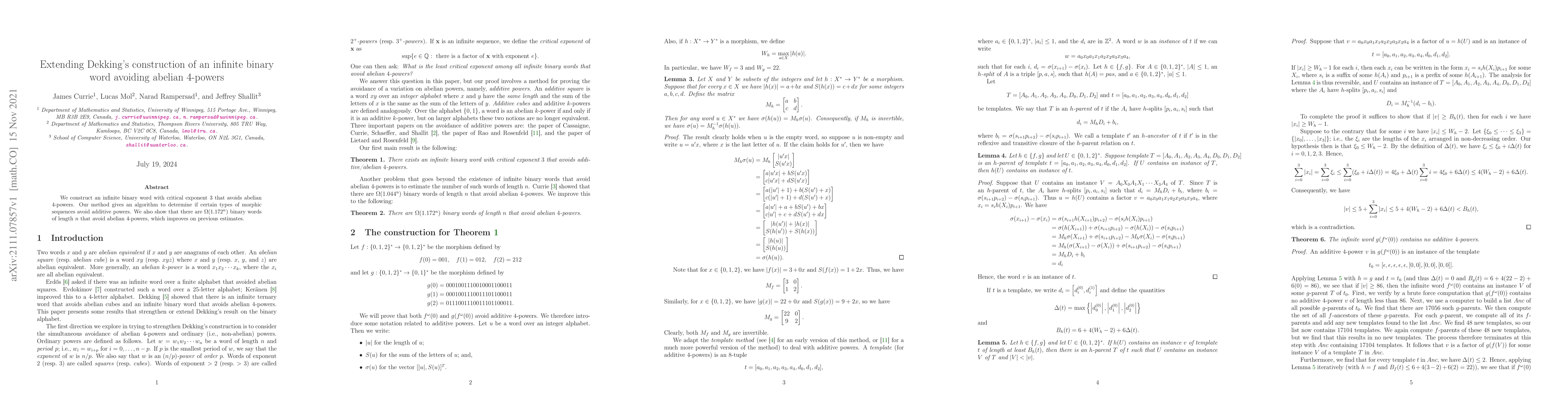 This paper constructs an infinite binary word avoiding abelian 4-powers with a critical exponent of 3. It also provides an algorithm to determine if morphic sequences avoid additive powers and improves previous estimates on the number of binary words avoiding abelian 4-powers.