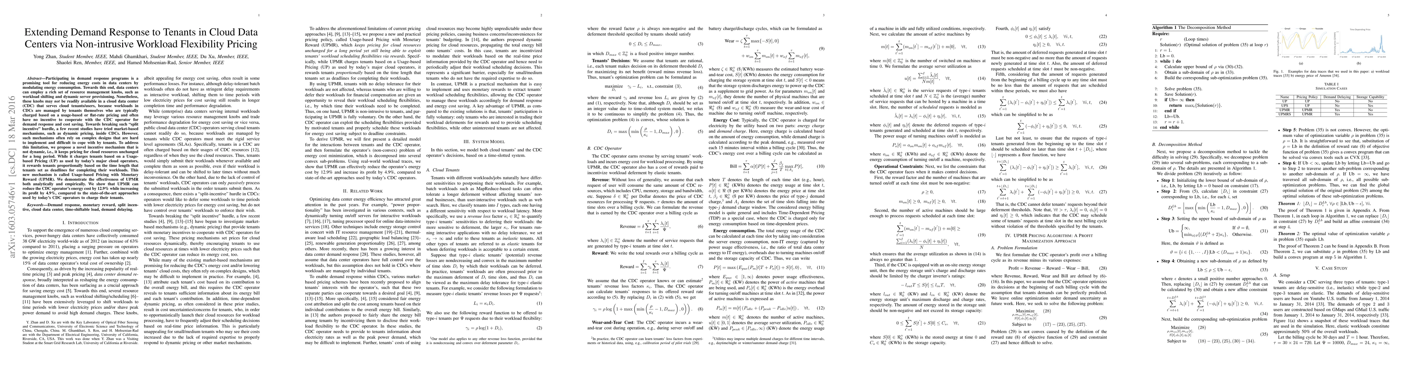 This paper proposes a novel Usage-based Pricing with Monetary Reward (UPMR) mechanism to incentivize cloud tenants to participate in demand response programs, thereby reducing energy costs in cloud data centers. UPMR rewards tenants based on workload deadlines, effectively addressing the split incentive problem without requiring dynamic pricing.