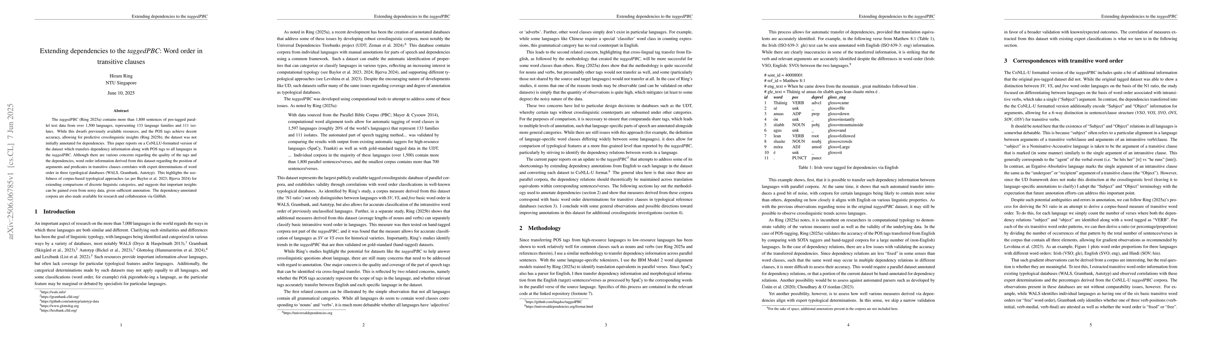 The taggedPBC (Ring 2025a) contains more than 1,800 sentences of pos-tagged parallel text data from over 1,500 languages, representing 133 language families and 111 isolates. While this dwarfs previously available resources, and the POS tags achieve decent accuracy, allowing for predictive crosslinguistic insights (Ring 2025b), the dataset was not initially annotated for dependencies. This paper reports on a CoNLLU-formatted version of the dataset which transfers dependency information along with POS tags to all languages in the taggedPBC. Although there are various concerns regarding the quality of the tags and the dependencies, word order information derived from this dataset regarding the position of arguments and predicates in transitive clauses correlates with expert determinations of word order in three typological databases (WALS, Grambank, Autotyp). This highlights the usefulness of corpus-based typological approaches (as per Baylor et al. 2023; Bjerva 2024) for extending comparisons of discrete linguistic categories, and suggests that important insights can be gained even from noisy data, given sufficient annotation. The dependency-annotated corpora are also made available for research and collaboration via GitHub.