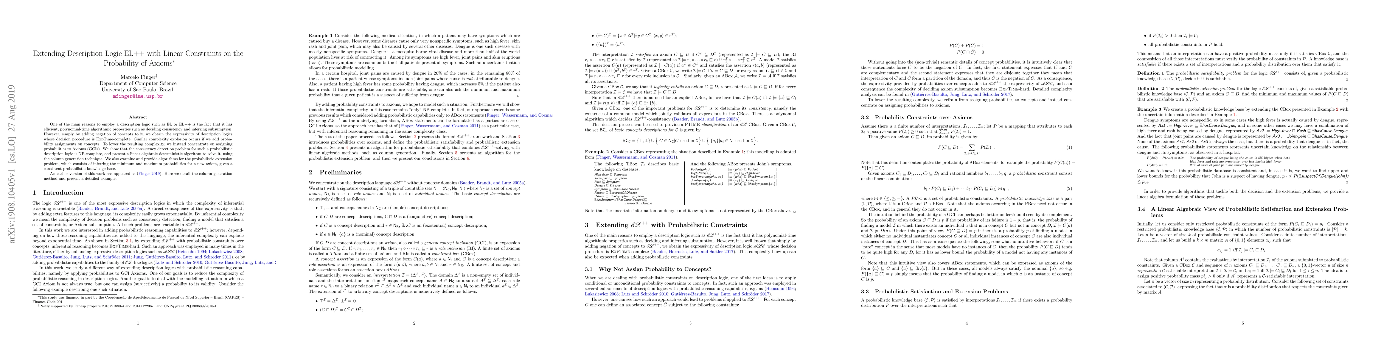 This research paper extends description logic EL++ with probabilistic constraints on axioms, developing a linear algebraic algorithm to solve consistency detection problems, and providing solutions for inferring minimum and maximum probabilities in a new axiom given a consistent knowledge base.